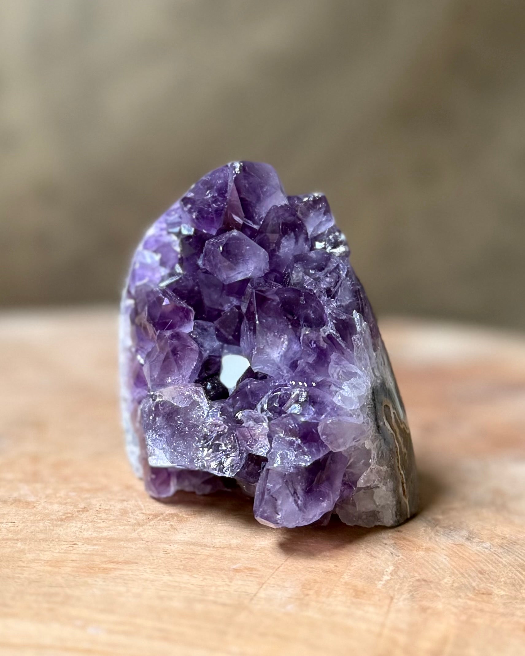 Deze prachtige amethist cut base is aan de onderzijde gezaagd, waardoor hij stevig rechtop kan staan. De dieppaarse kristallen vangen het licht op een mooie manier en maken dit stuk een echte eyecatcher in ieder interieur.