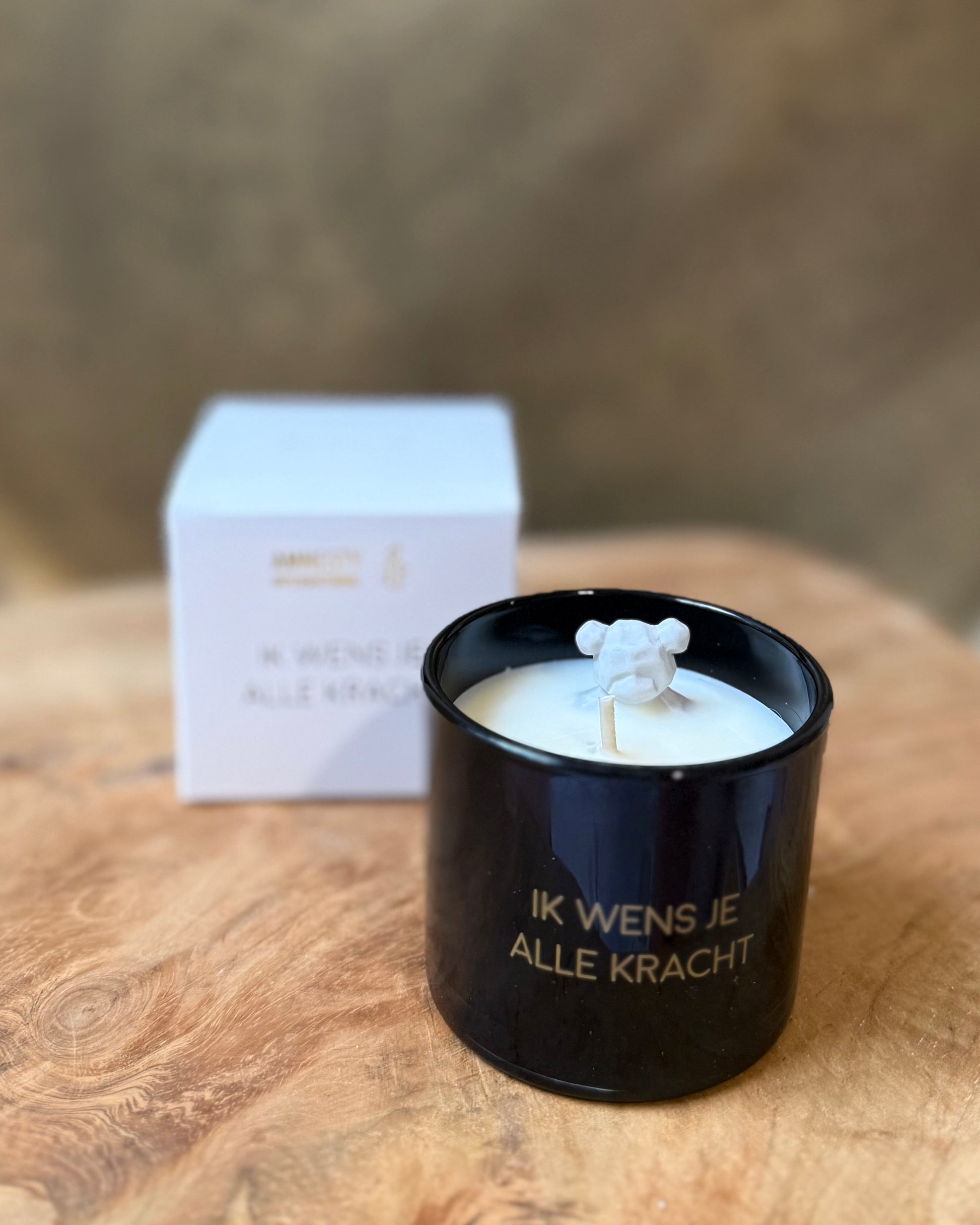 In de kaars zit een beertje als token voor een knuffel. De ontvanger kan het beertje bij zich dragen of op een speciaal plekje leggen en zal dan worden herinnerd dat jij aan hem/ haar denkt.