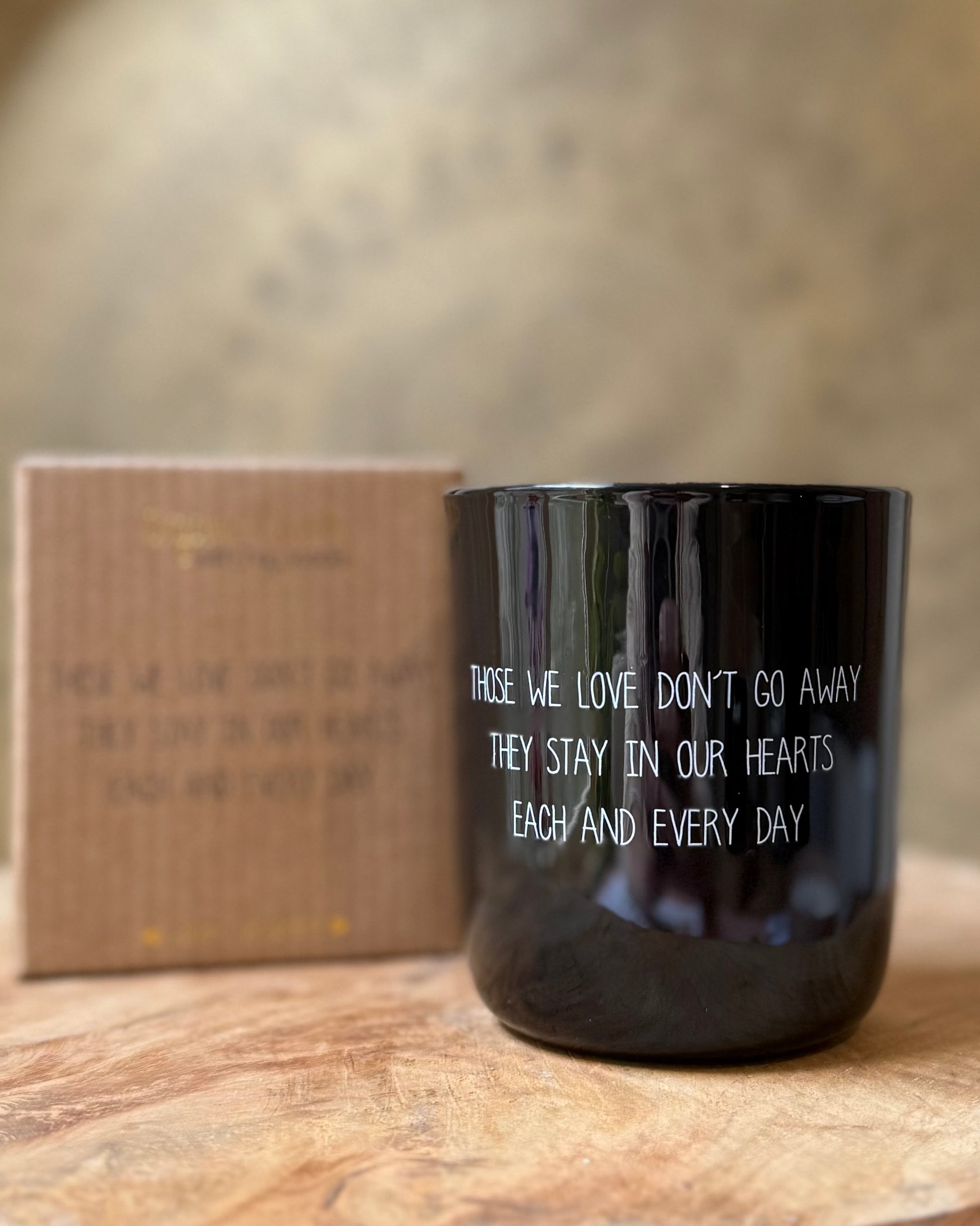 Deze geurkaars kan je cadeau doen aan iemand die een dierbare heeft verloren. De kaars heeft een super lieve tekst waarmee je de ontvanger een hart onder de riem steekt. De tekst op deze kaars luidt: Those we love don't go away. They stay in our hearts each and every day.