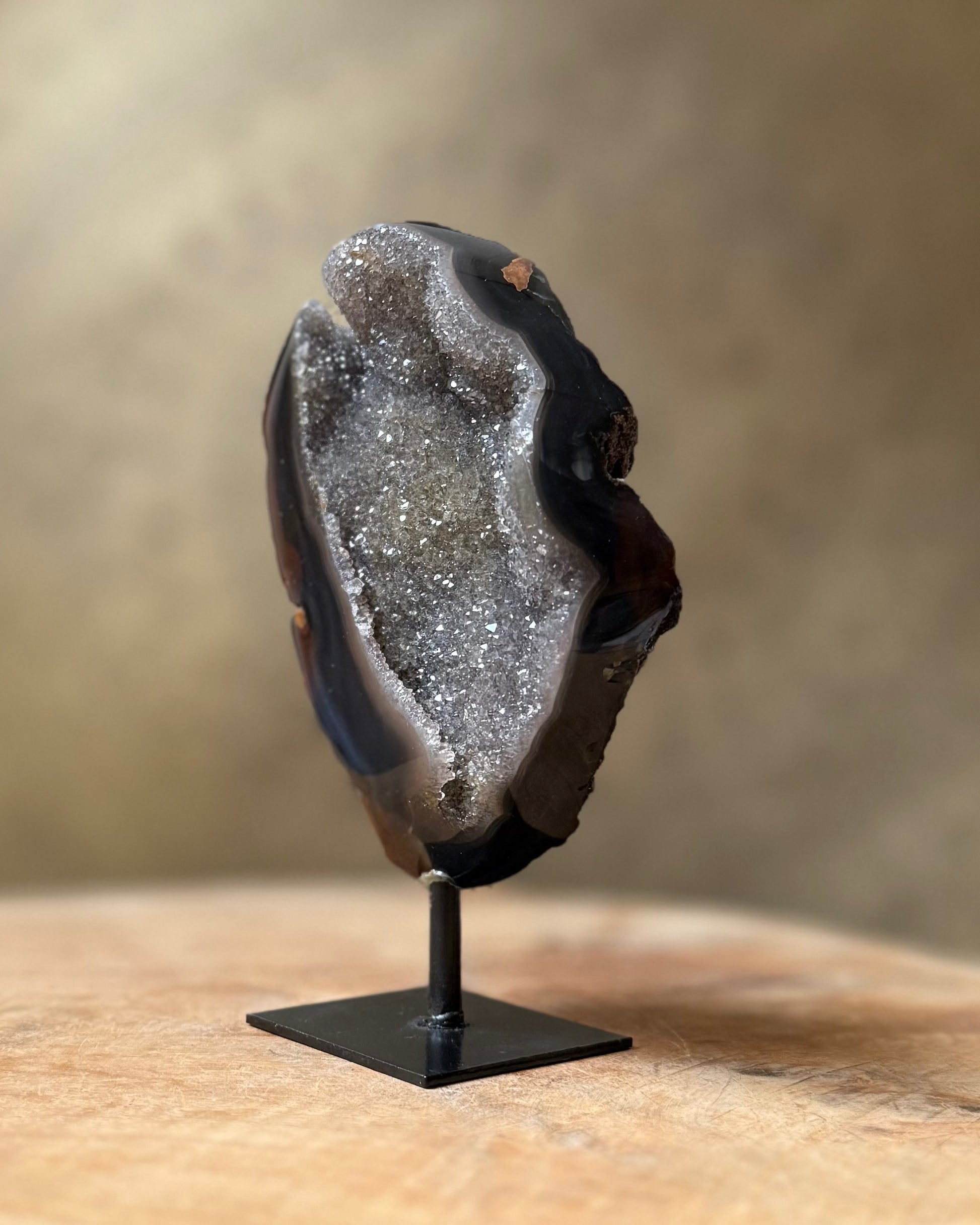Mooie, bijzondere, donkere Agaat geode op standaard.