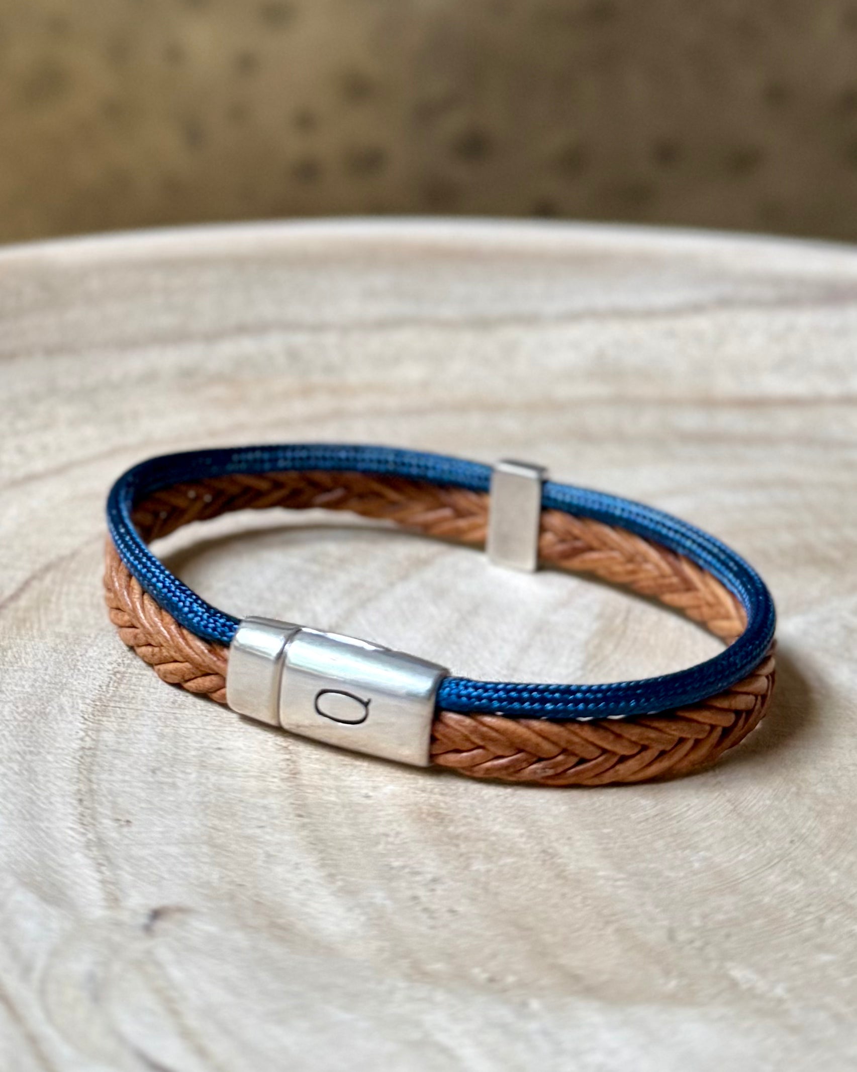Een armband gemaakt van een leren vlecht met paracord samengehouden door een zilverkleurige schuiver. De armband sluit met een zilverkleurige, hoogwaardige, nikkelvrije magneetsluiting. De armband is ongeveer 10mm breed.