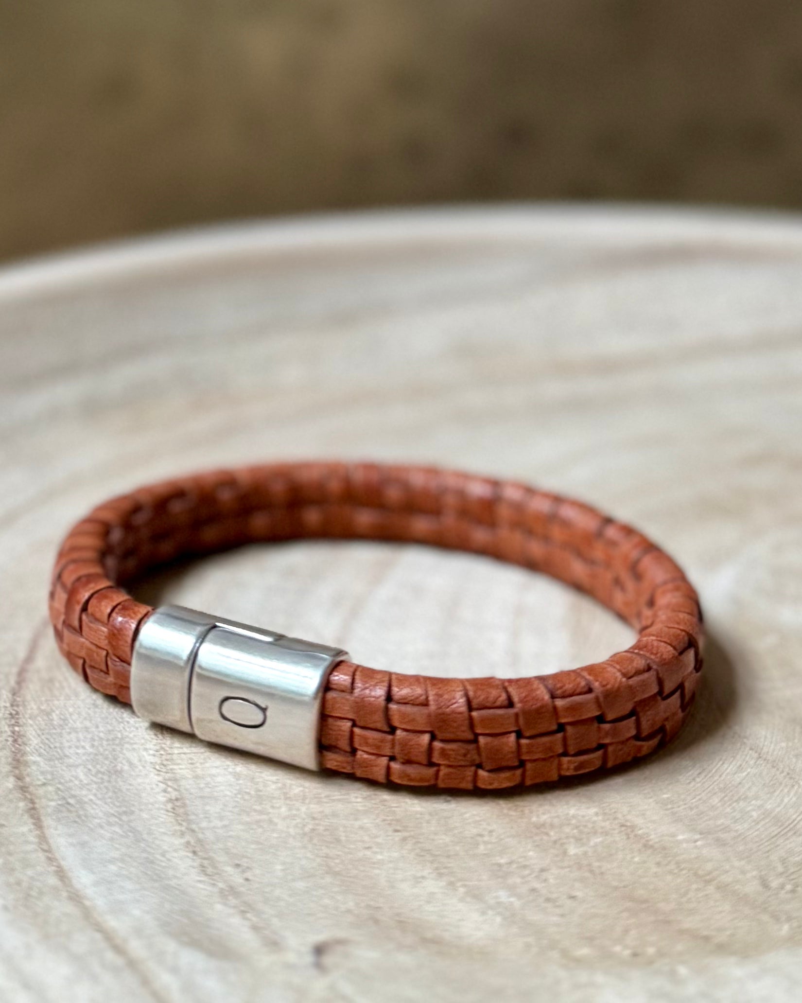 Deze armband heeft een prachtig gevlochten patroon, is van hoogwaardig leer en sluit met een zilverkleurige, hoogwaardige, nikkelvrije magneetsluiting. De armband is ongeveer 12mm breed.