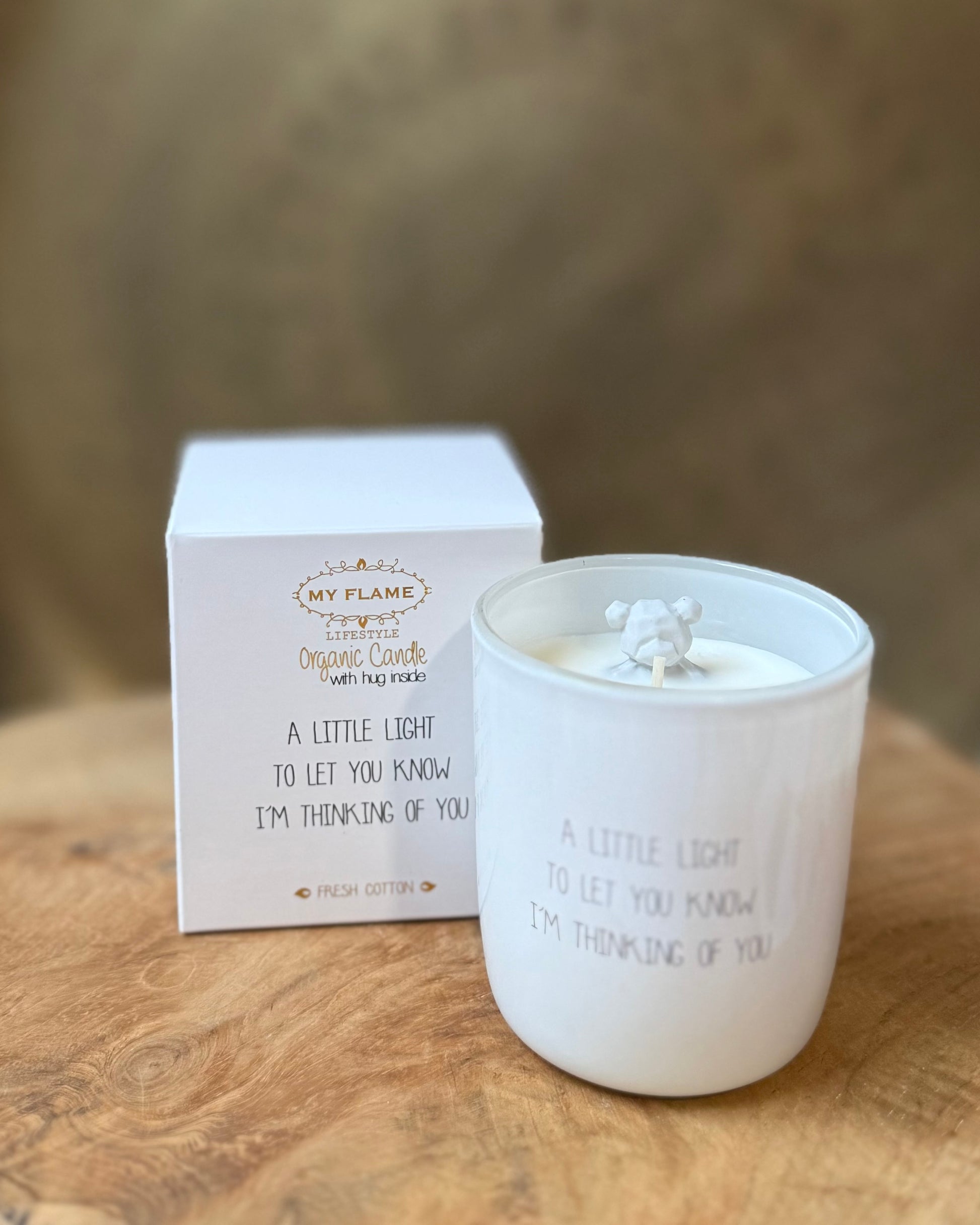 In de kaars zit een beertje als token voor een knuffel. De ontvanger kan het beertje bij zich dragen of op een speciaal plekje leggen en zal dan worden herinnerd dat jij aan hem/ haar denkt.