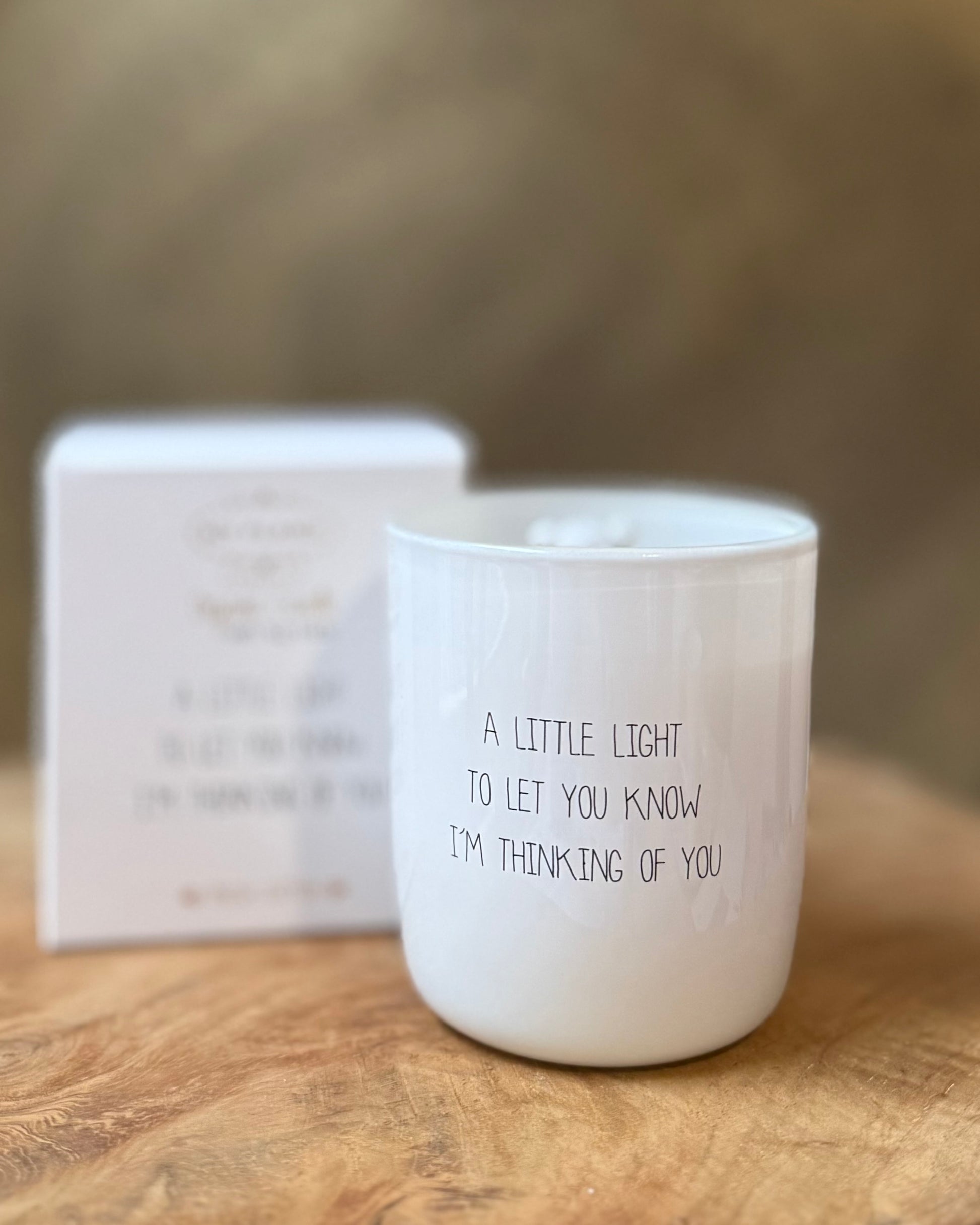 Deze geurkaars kan je cadeau doen aan iemand om te laten weten dat hij/ zij niet alleen is en dat je meeleeft. De kaars heeft een super lieve tekst waarmee je de ontvanger een hart onder de riem steekt. De tekst op deze kaars luidt: A little light to let you know I'm thinking of you.