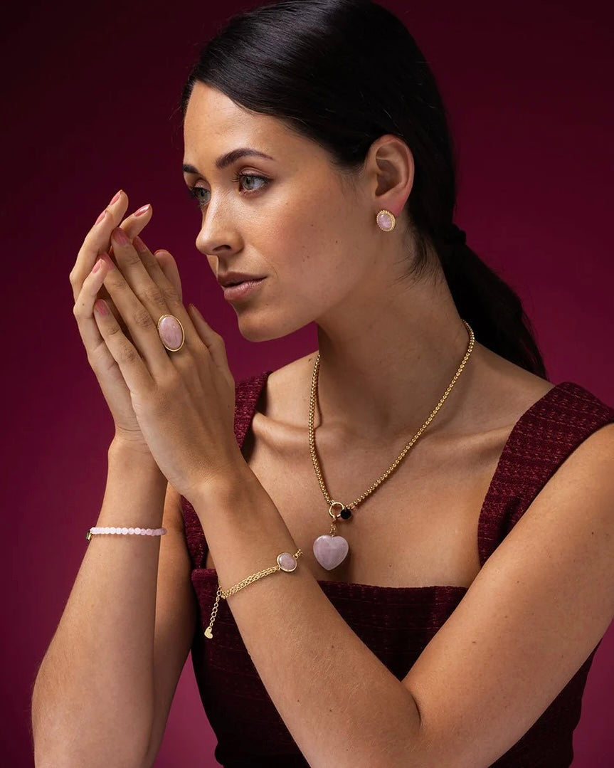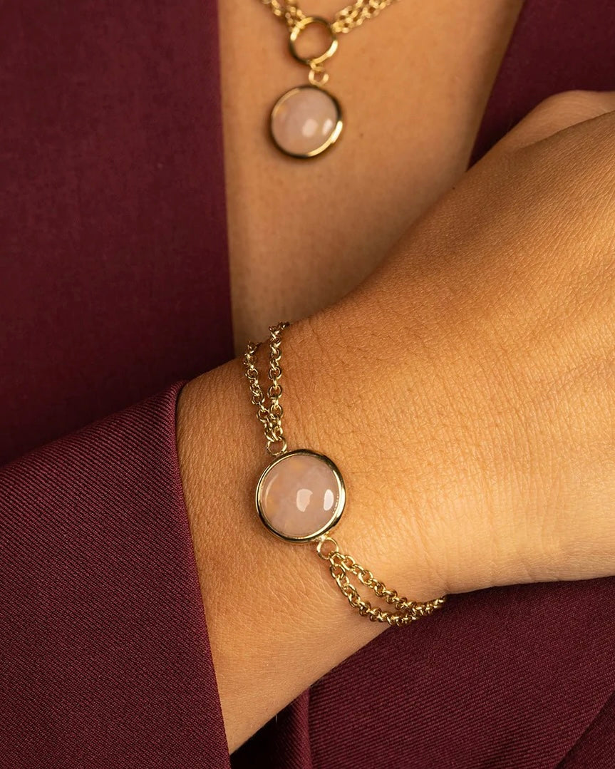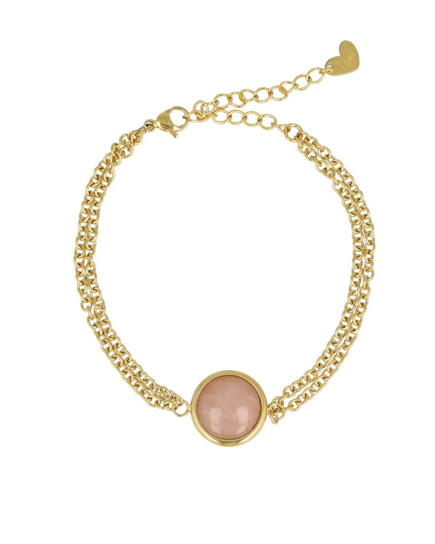 De armband heeft een dubbele gold plated armband met een centrale Rozekwarts edelsteen van 12,5 mm. Rozekwarts is dé steen van liefde, harmonie en vrouwelijke energie.