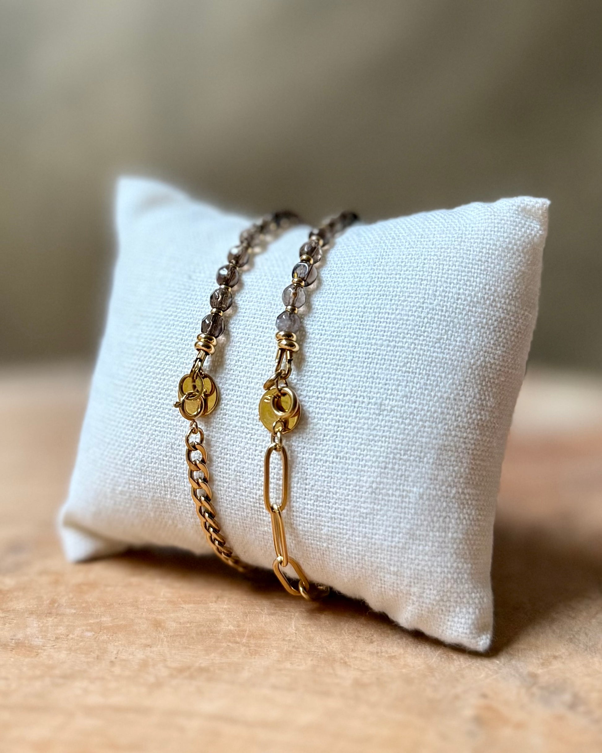Kies eerst een basisarmband van Solid Gold en voeg een edelsteen tussenstuk toe. Maak je armband eventueel compleet met een mooie hanger.