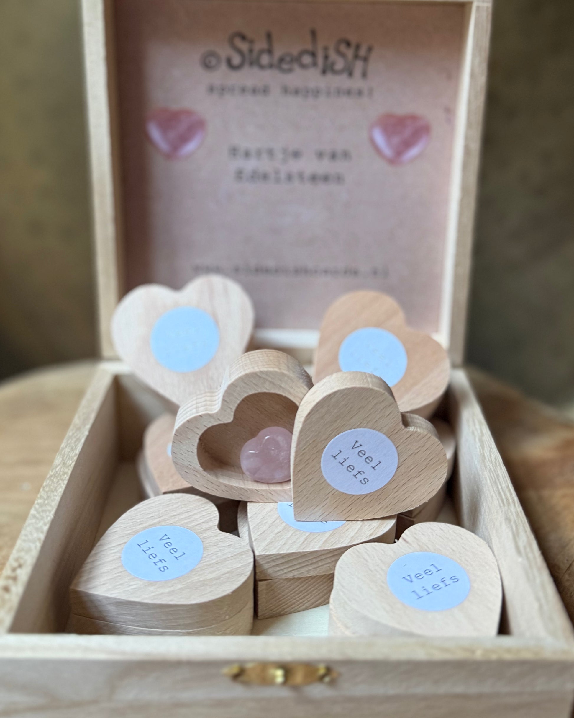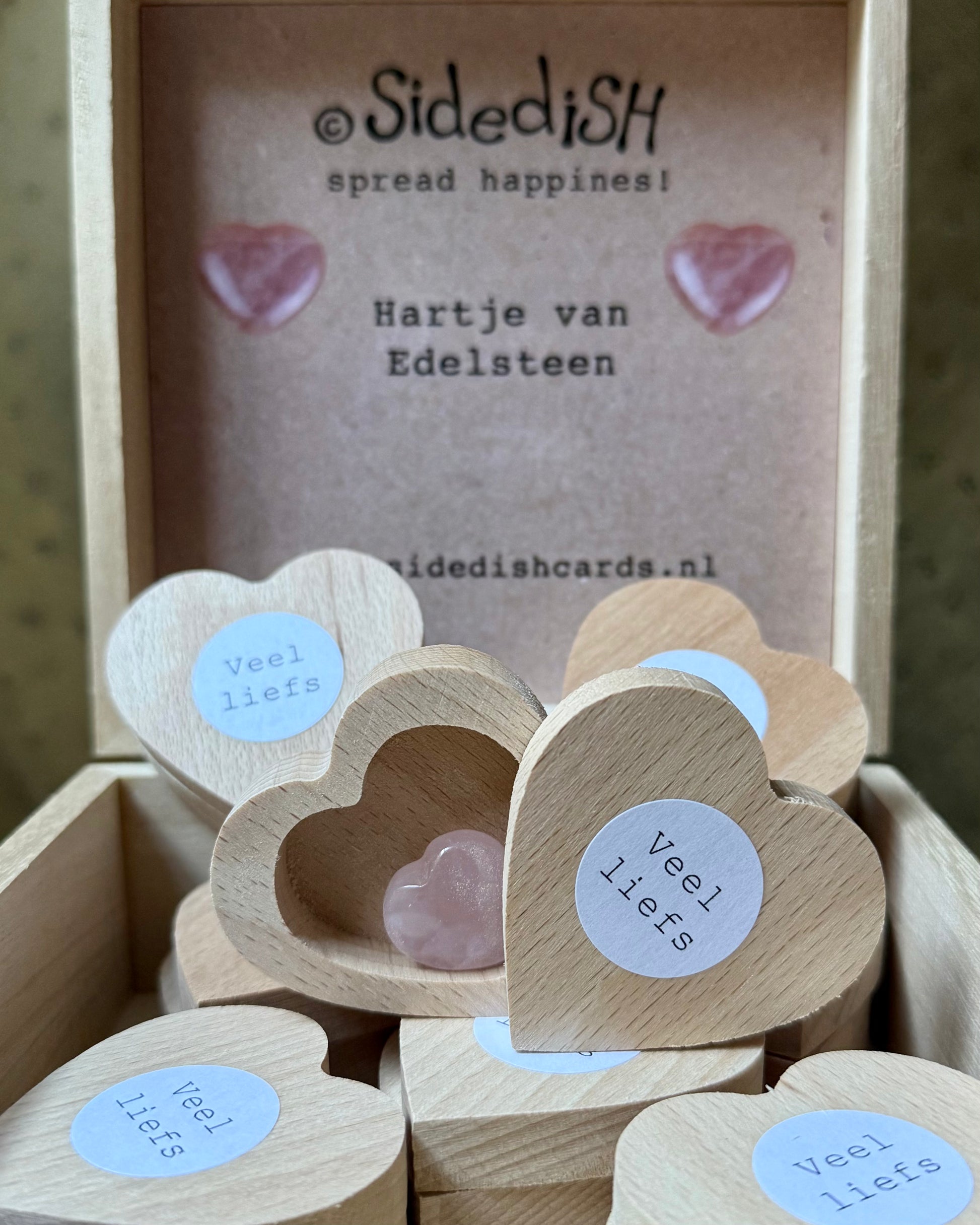 Hartje van Rozenkwarts in houten harten doosje, wat een lief cadeautje!