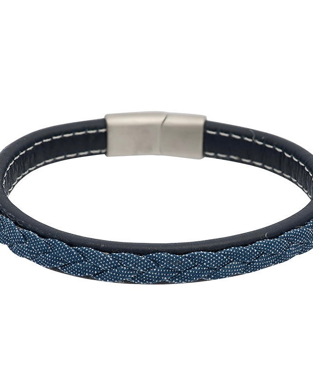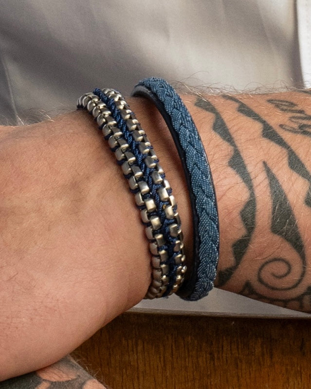 De armband Jack is een zwartlederen armband die bestaat uit een smalle, gladde leren band met daarop een mooi gevlochten design weergegeven in de kleur jeansblauw.