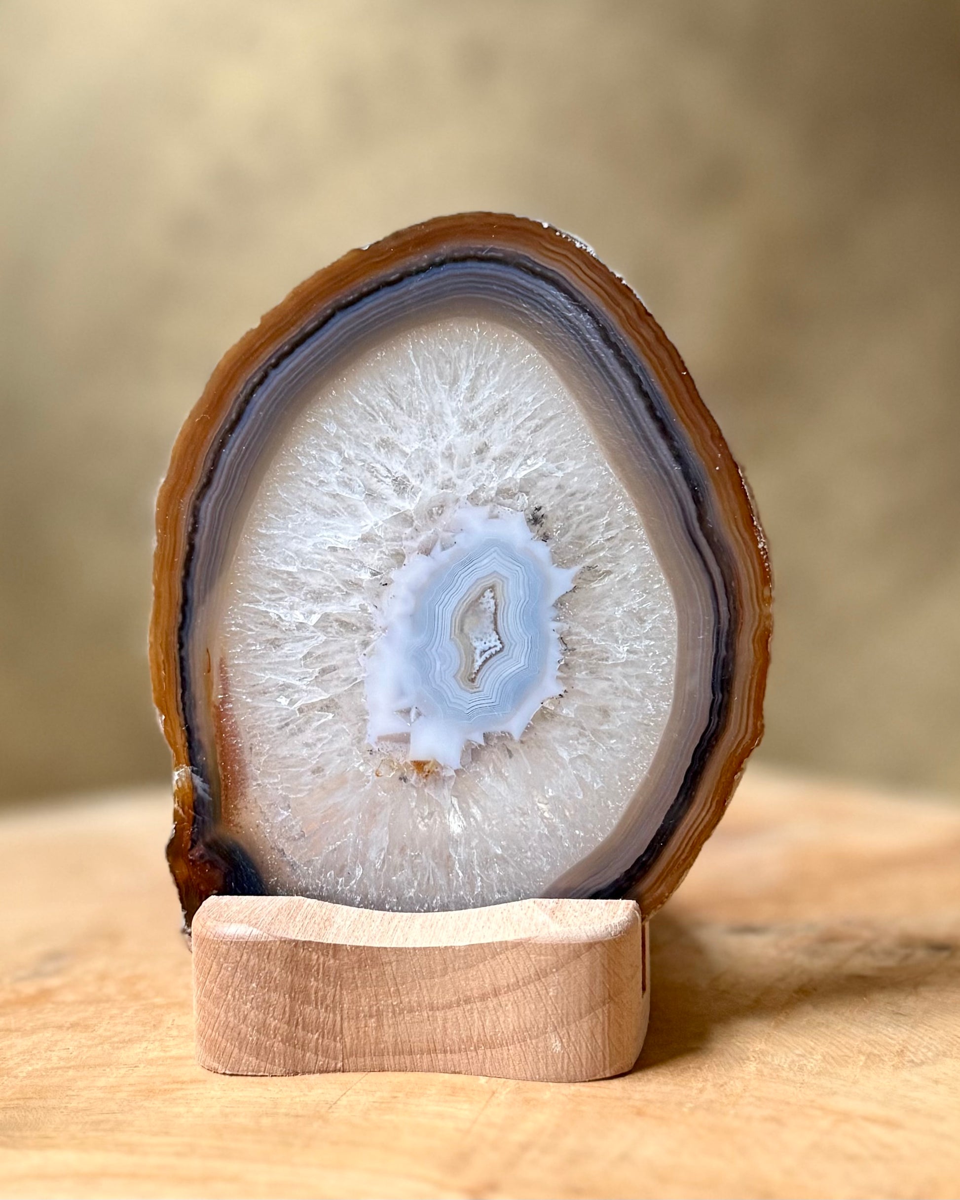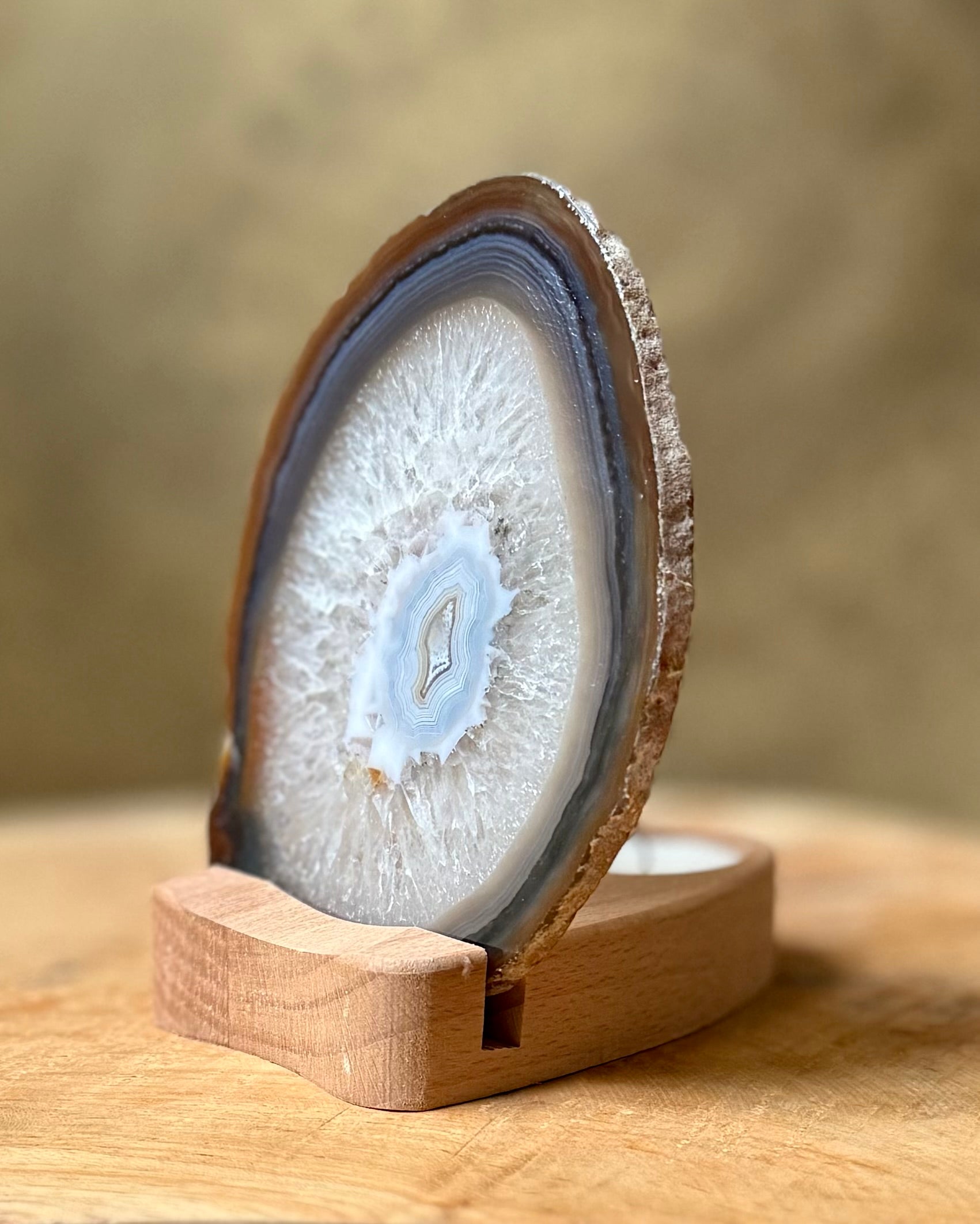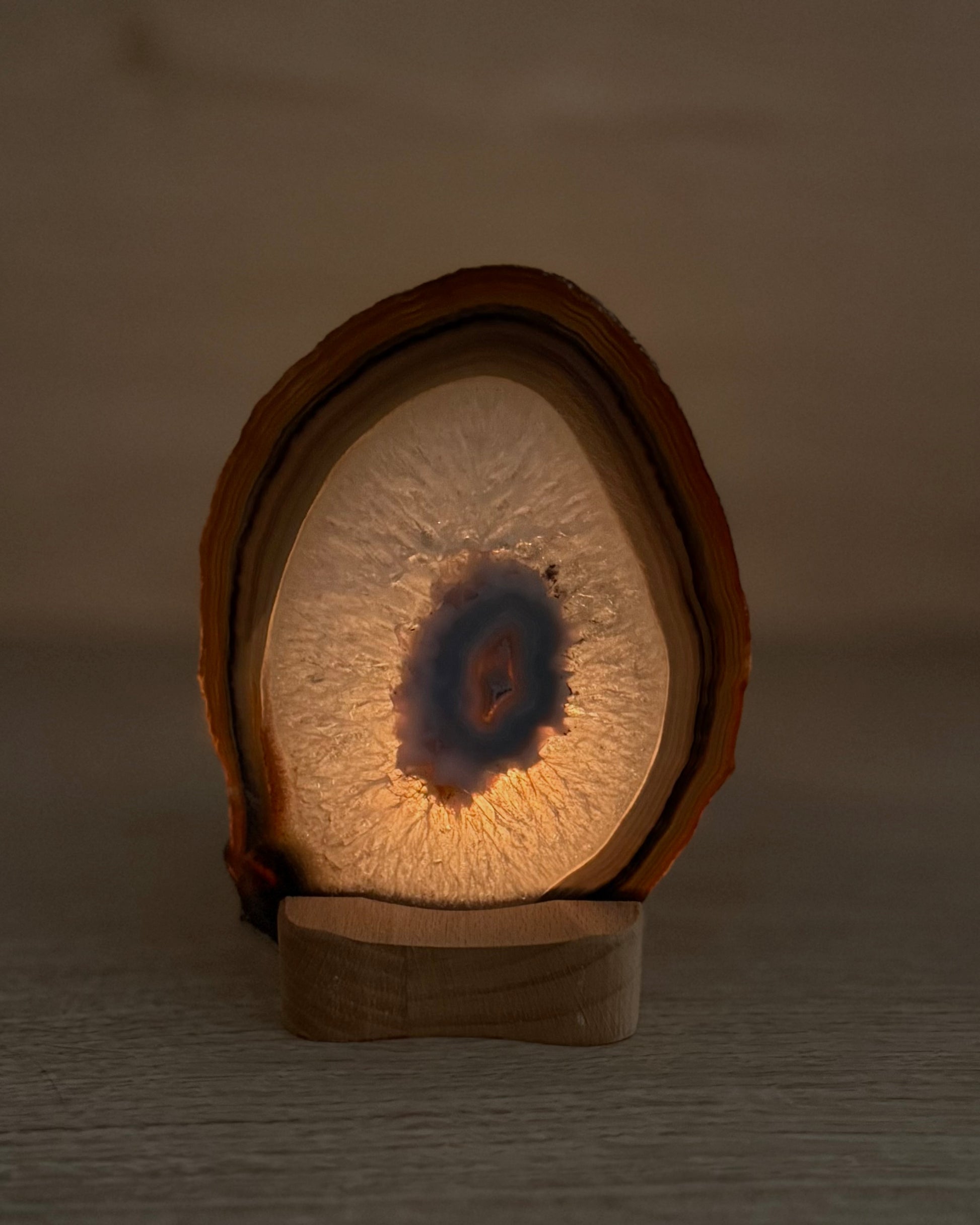 Agaatschijf met houten waxinelichthouder.