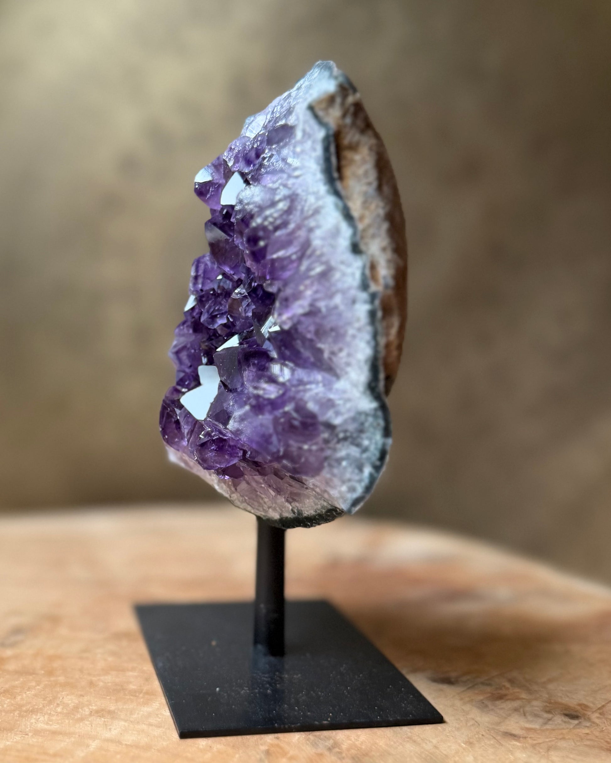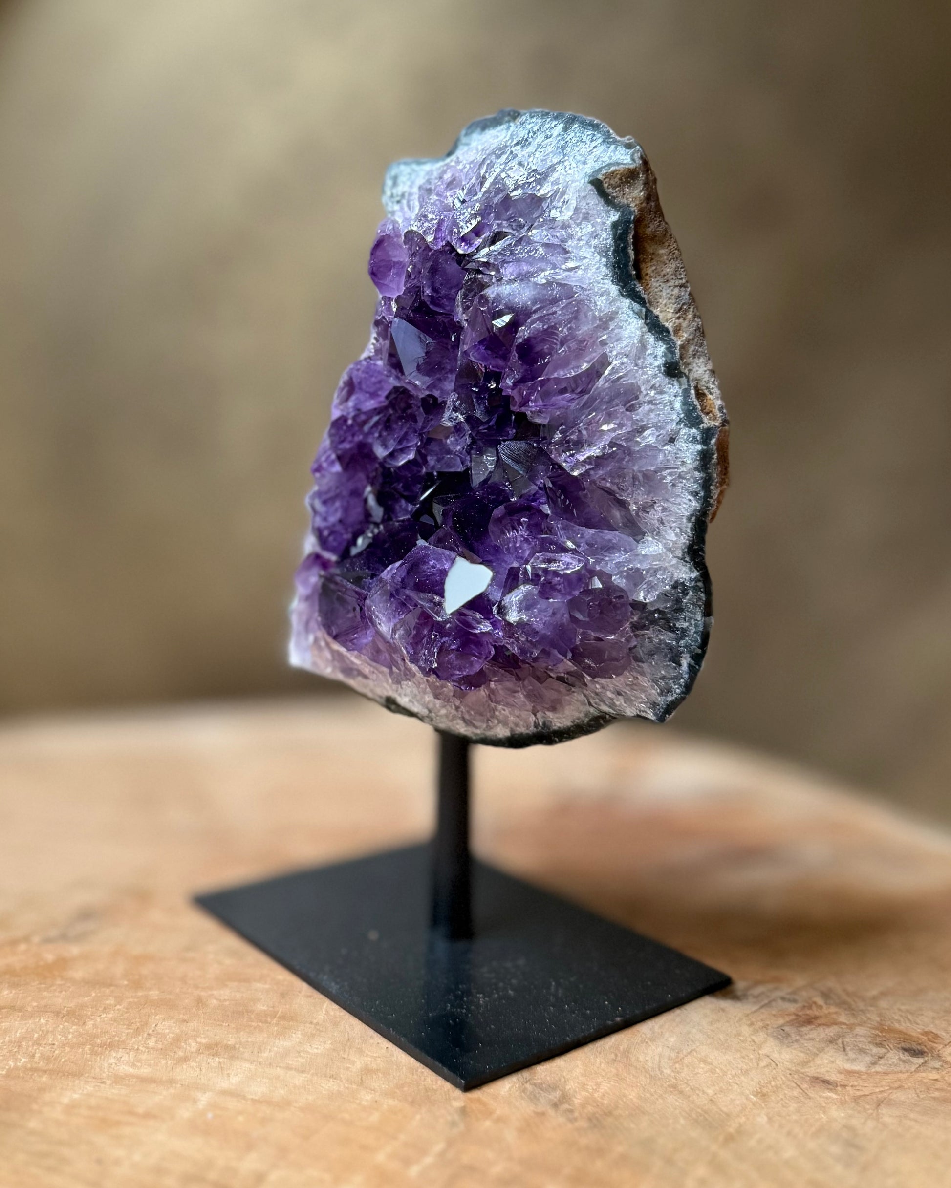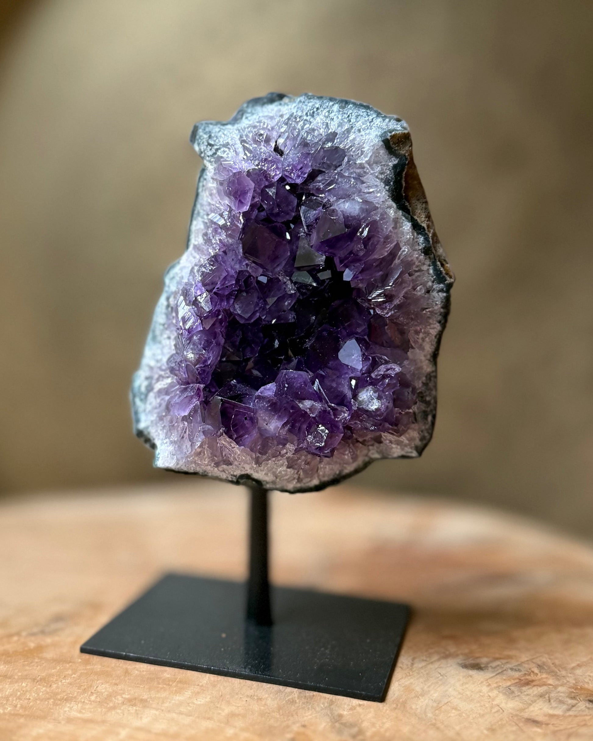 Mooie, donkerpaarse, grote, ruwe Amethist op standaard.