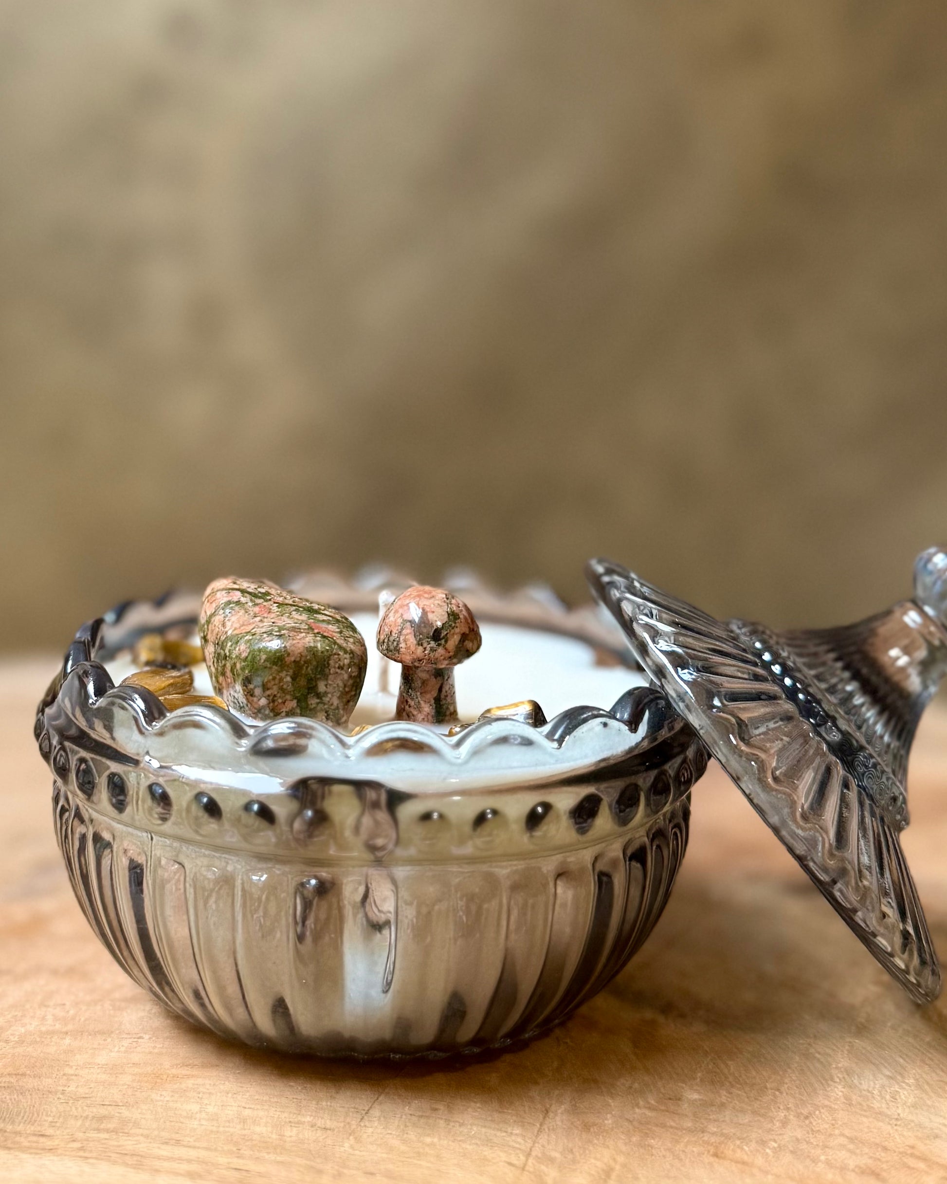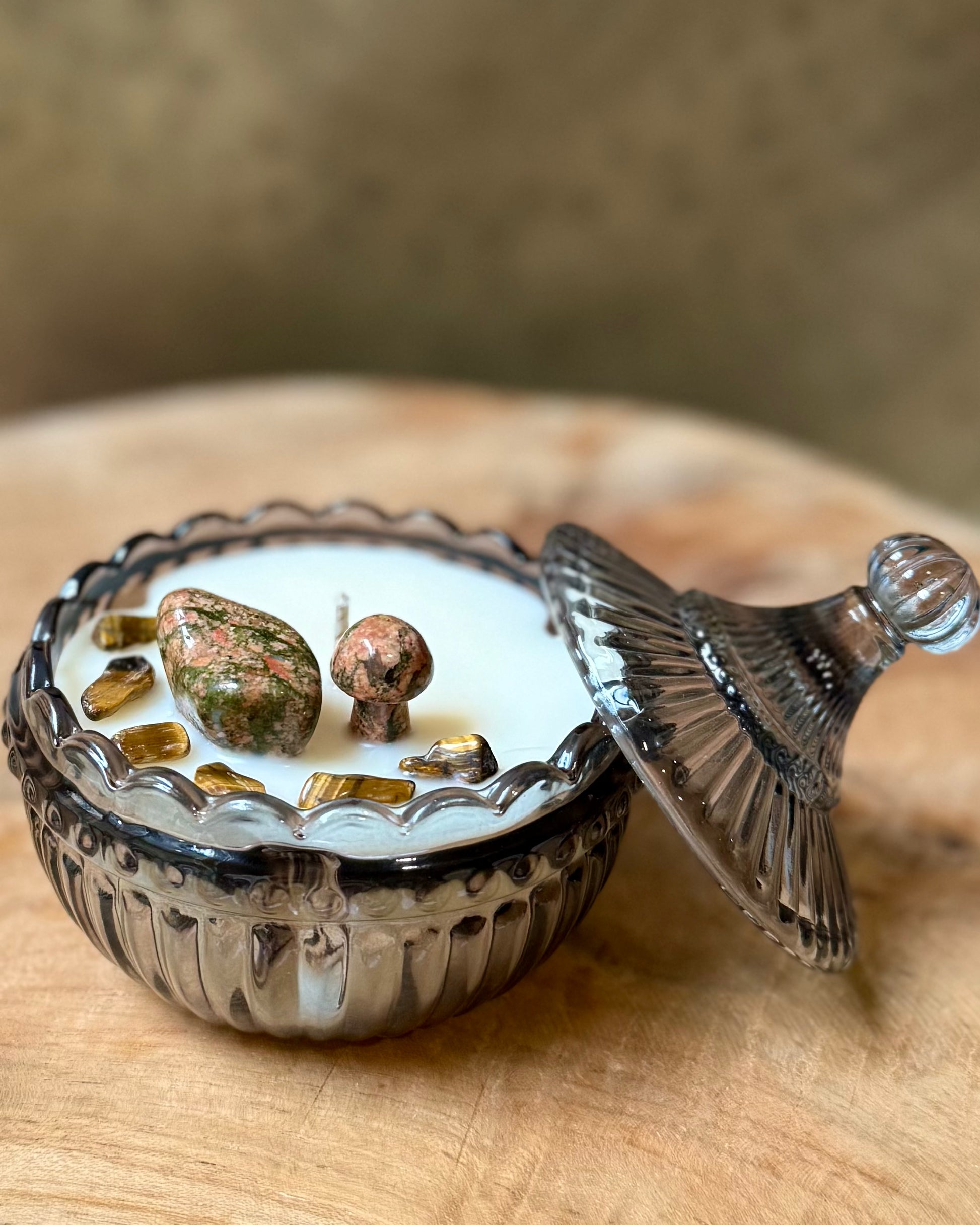 De kaars is opgemaakt met een Unakiet paddenstoeltje en knuffelsteen en Tijgeroog split.