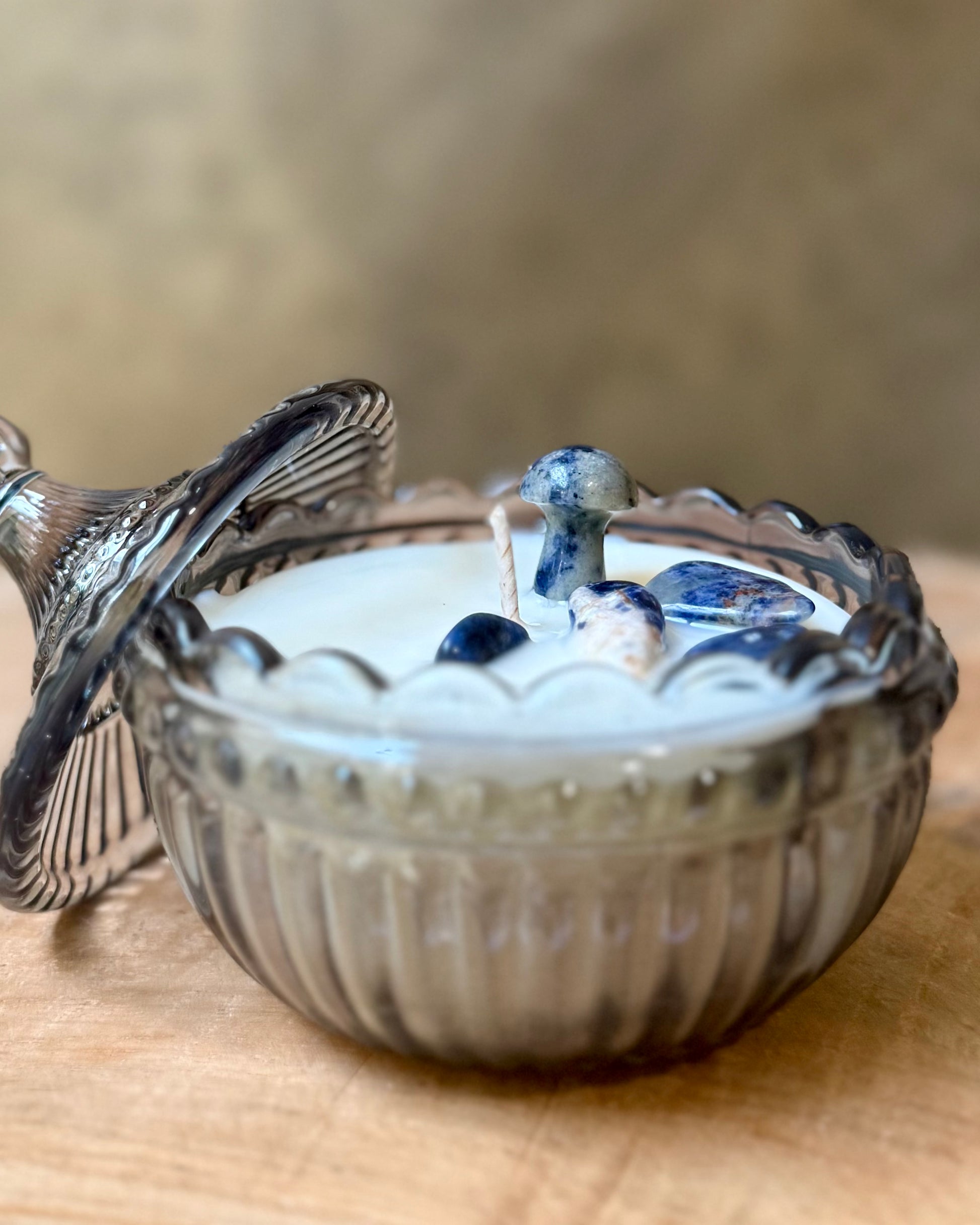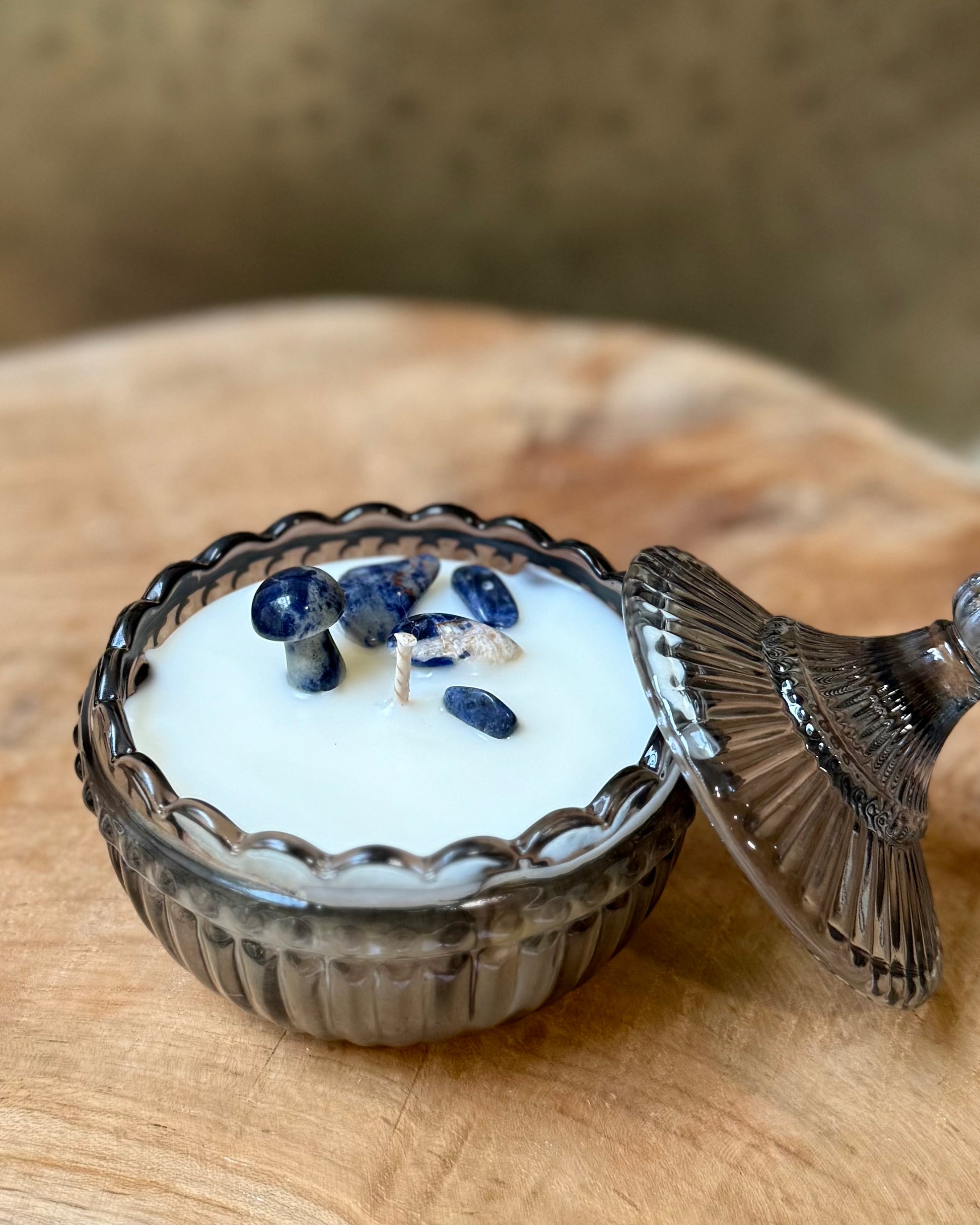 De kaars is opgemaakt met een Sodaliet paddenstoeltje en Sodaliet steentjes.