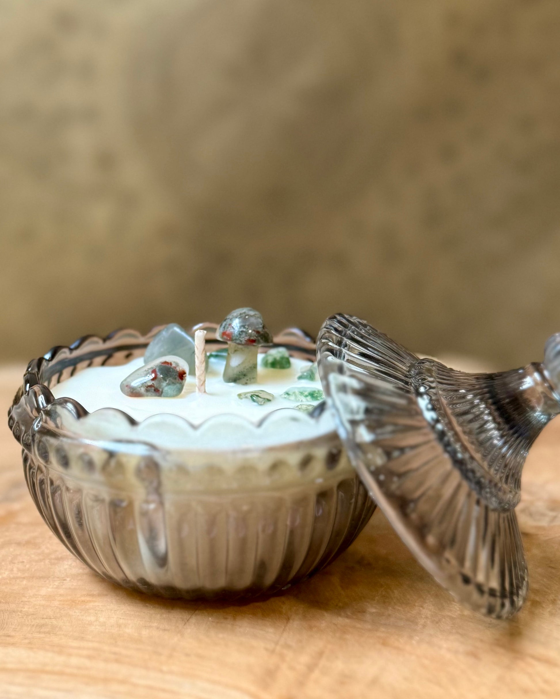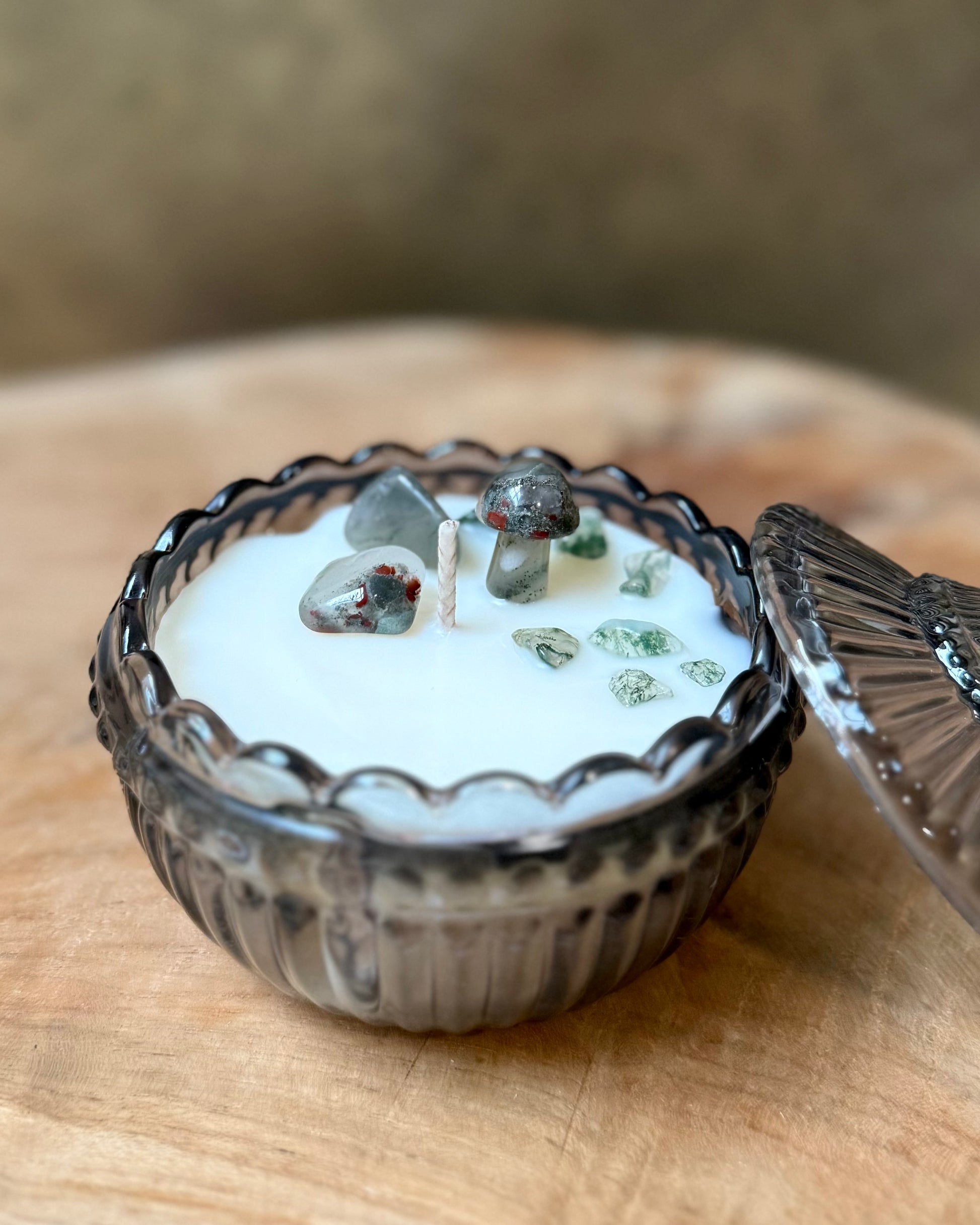 De kaars is opgemaakt met een Drakenbloed Jaspis  paddenstoeltje, Drakenbloed Jaspis steentjes en Mosagaat split.