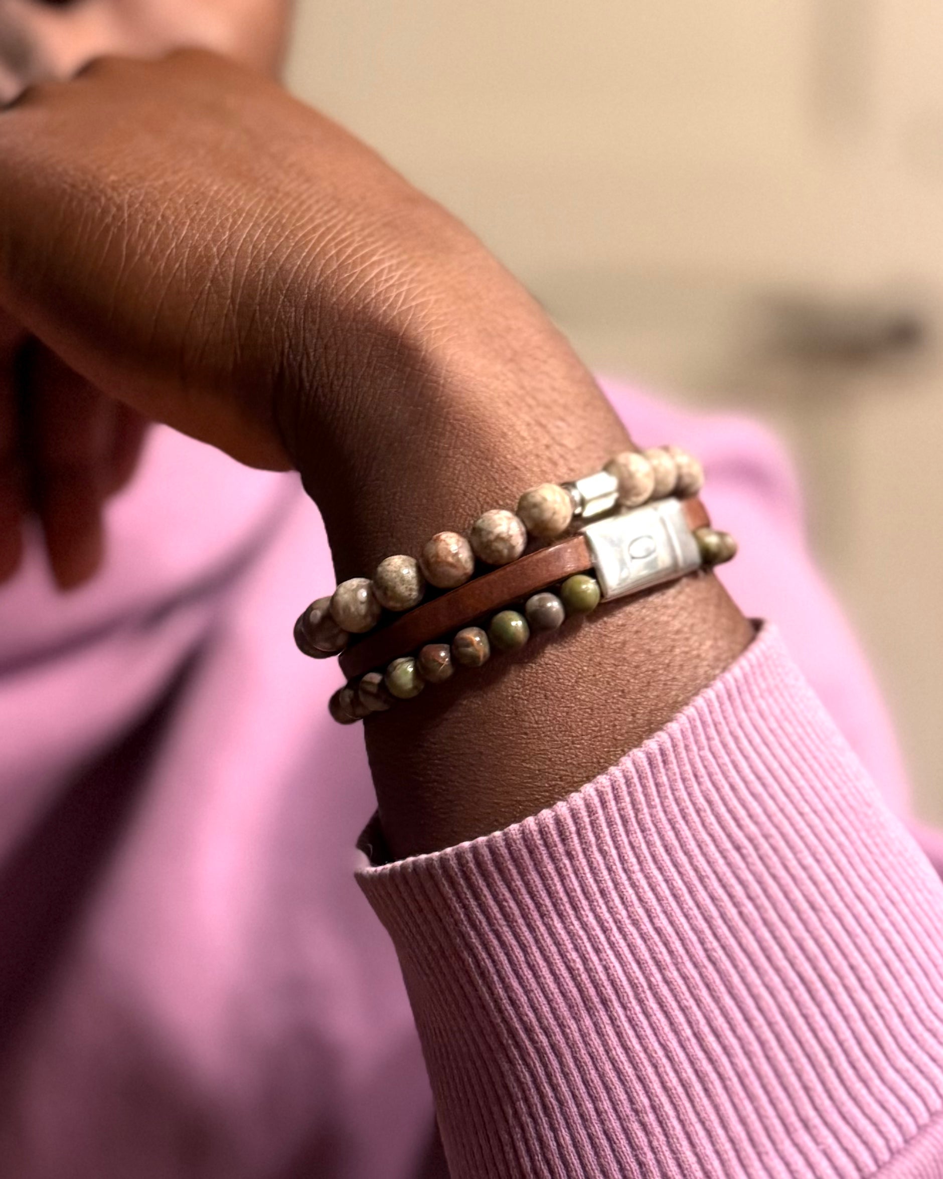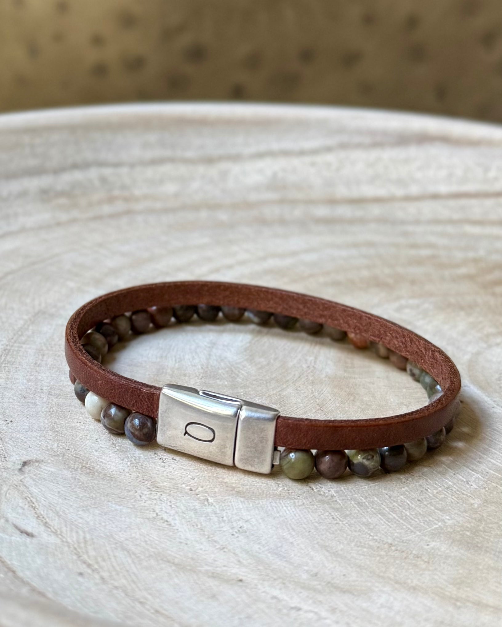 Een bruin leren armband van Qoss gecombineerd met een rij natuurstenen Floweragaat kralen van 6mm. De armband sluit met een magneetsluiting.
