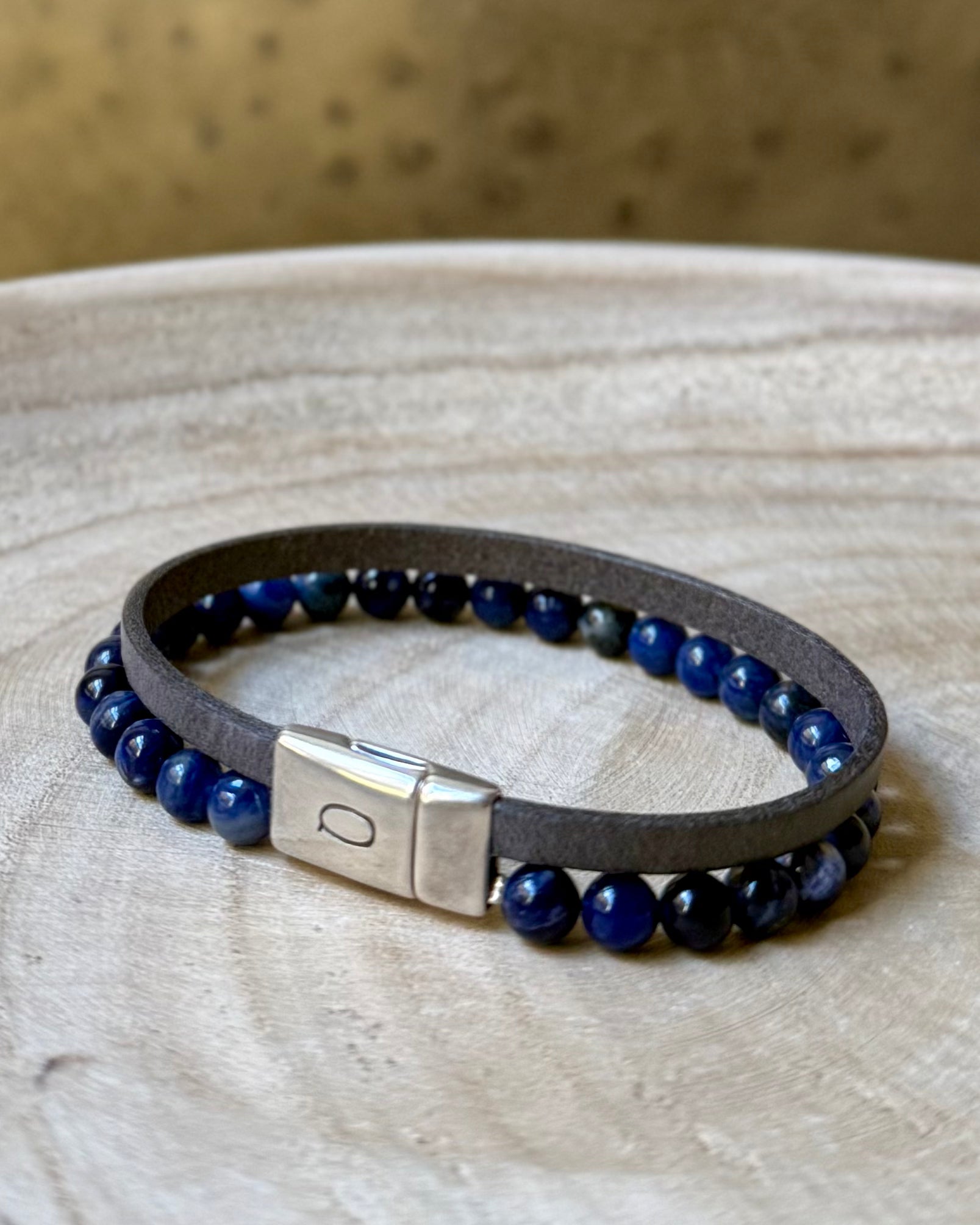 Een donkergrijs leren armband van Qoss gecombineerd met een rij natuurstenen Sodaliet kralen van 6mm. De armband sluit met een magneetsluiting.