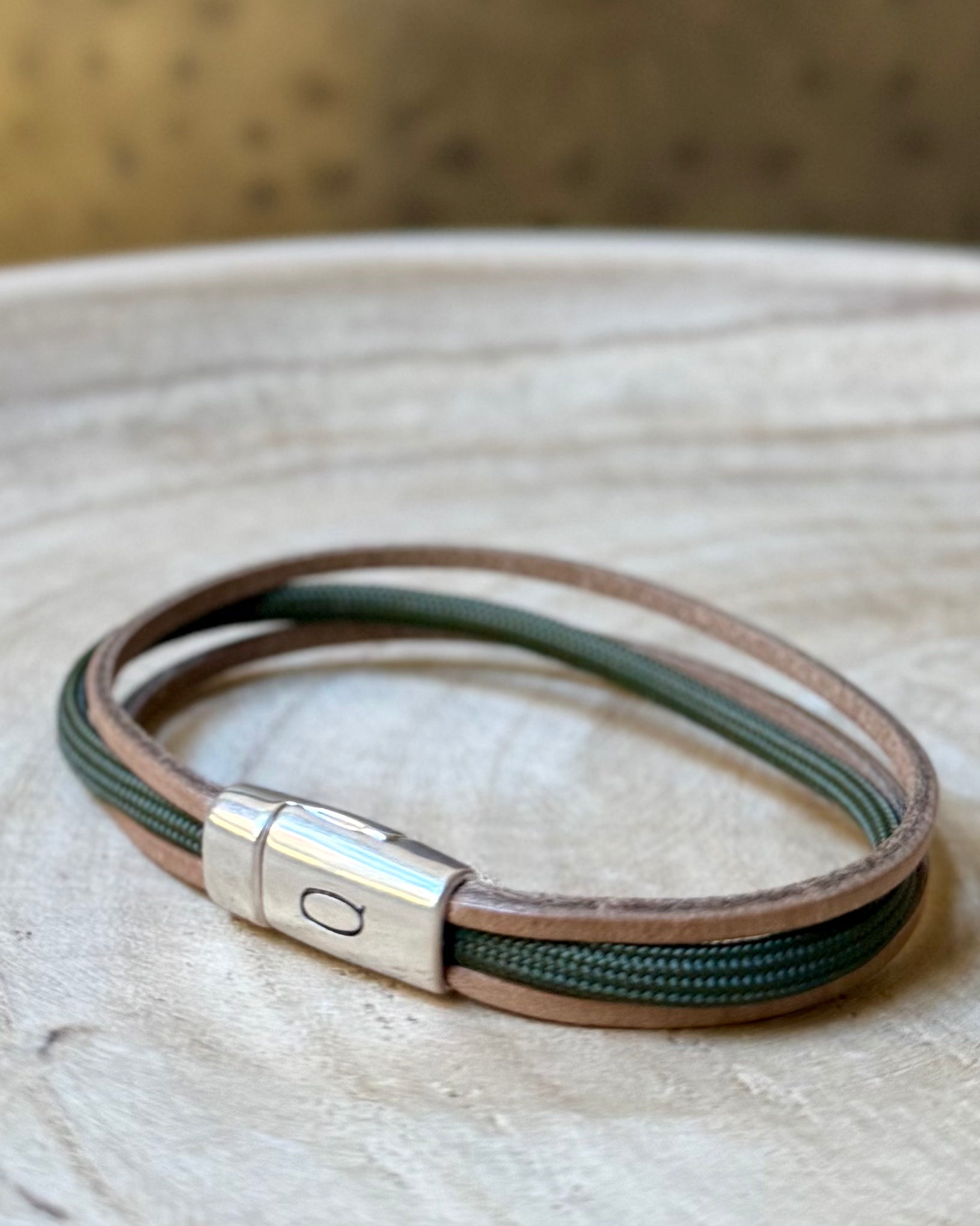 Een armband gemaakt van twee leren banden met paracord in het midden. De armband sluit met  een zilverkleurige, hoogwaardige, nikkelvrije magneetsluiting. De armband is ongeveer 15mm breed.