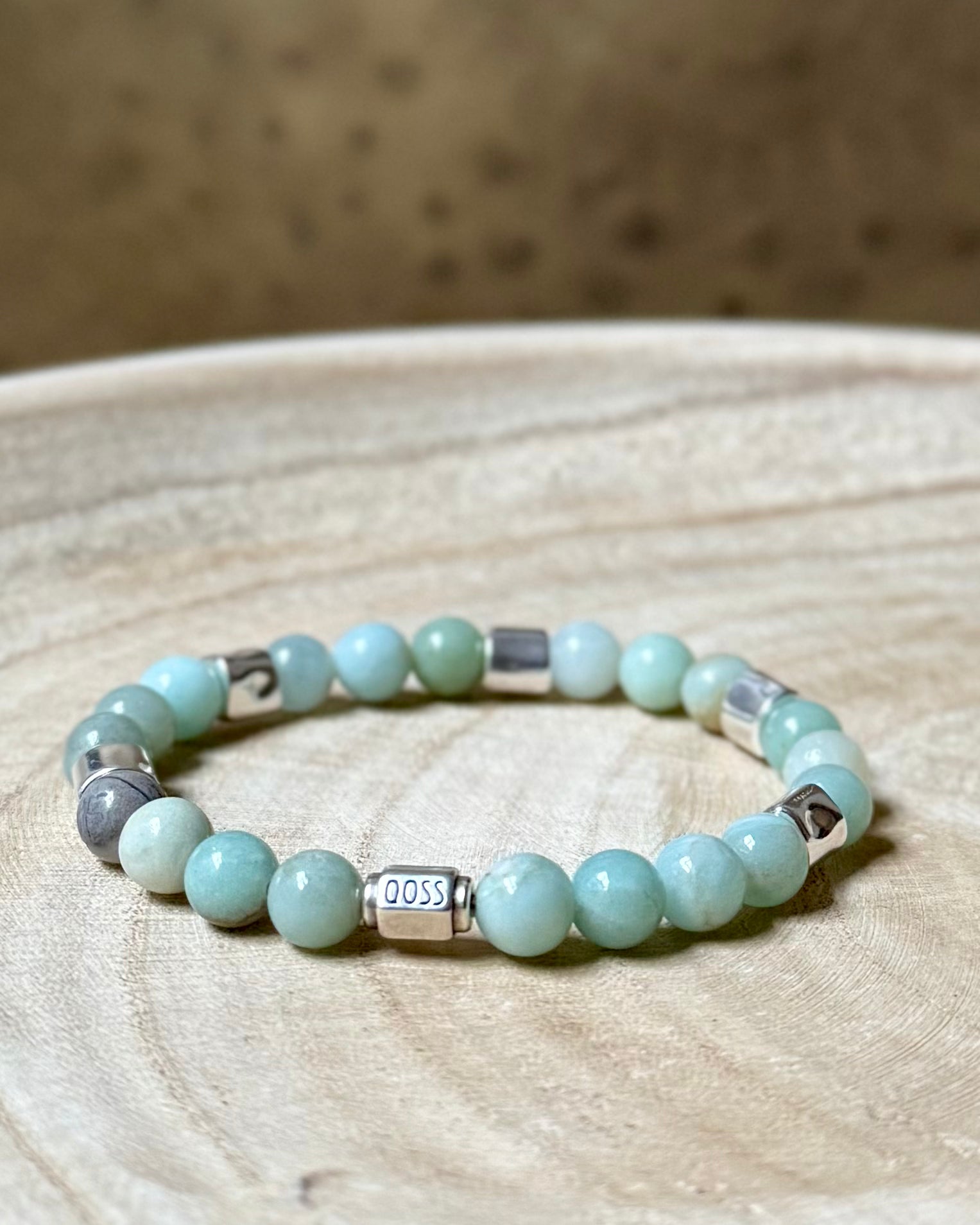 Een natuurstenen kralen armband geregen op elastiek, voorzien van een zilverkleurige tube kralen en een kraal met QOSS van hoogwaardig, nikkelvrij metaal. De kralen zijn ongeveer 8mm.