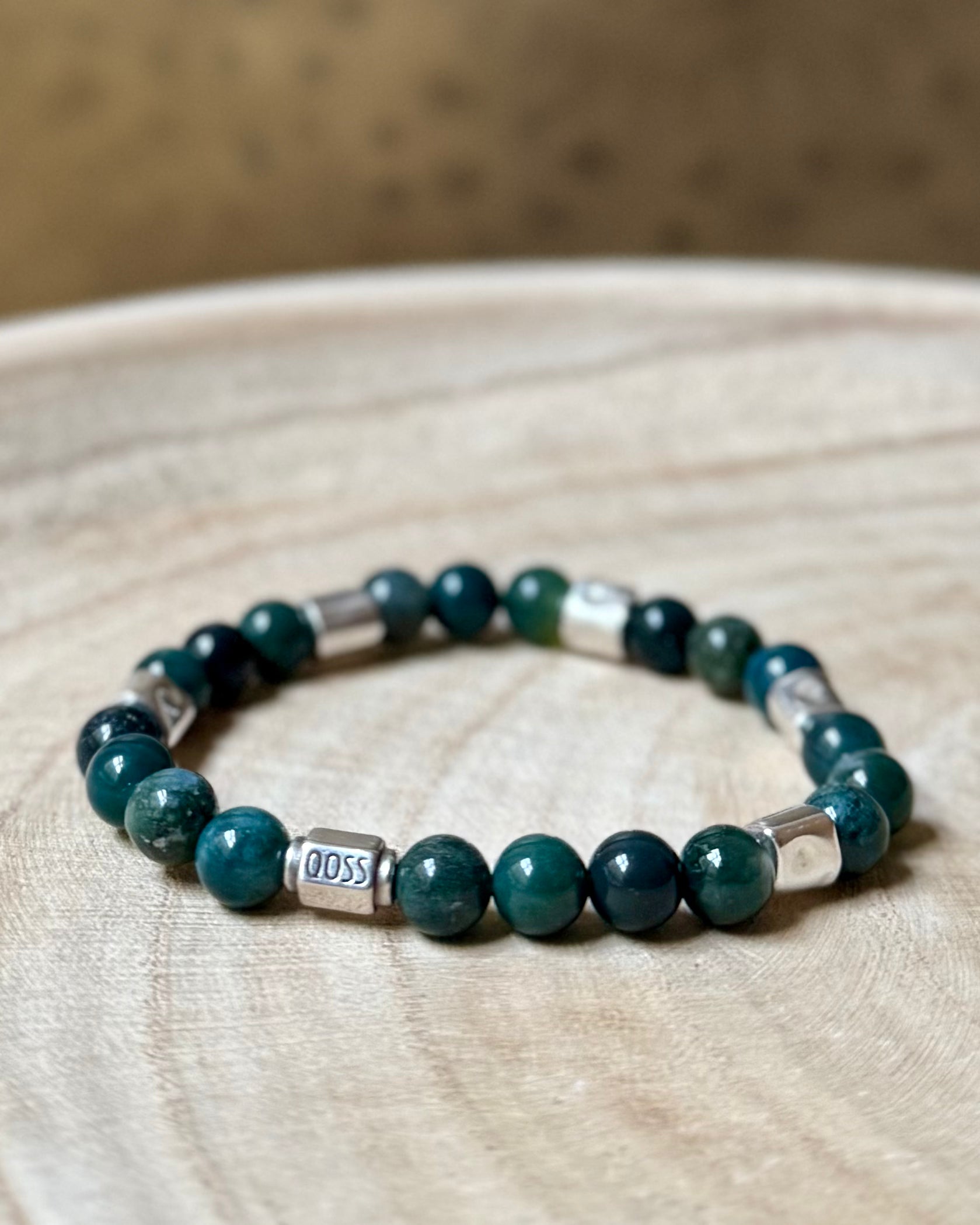 Een natuurstenen kralen armband geregen op elastiek, voorzien van een zilverkleurige tube kralen en een kraal met QOSS van hoogwaardig, nikkelvrij metaal. De kralen zijn ongeveer 8mm.