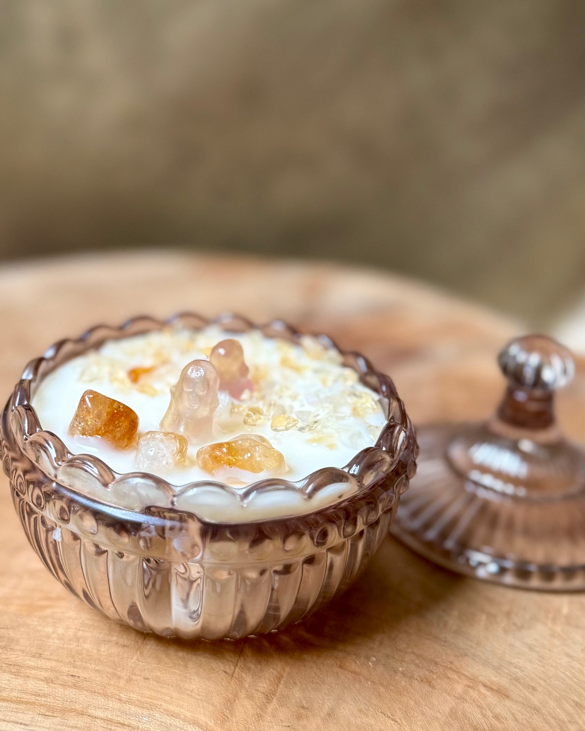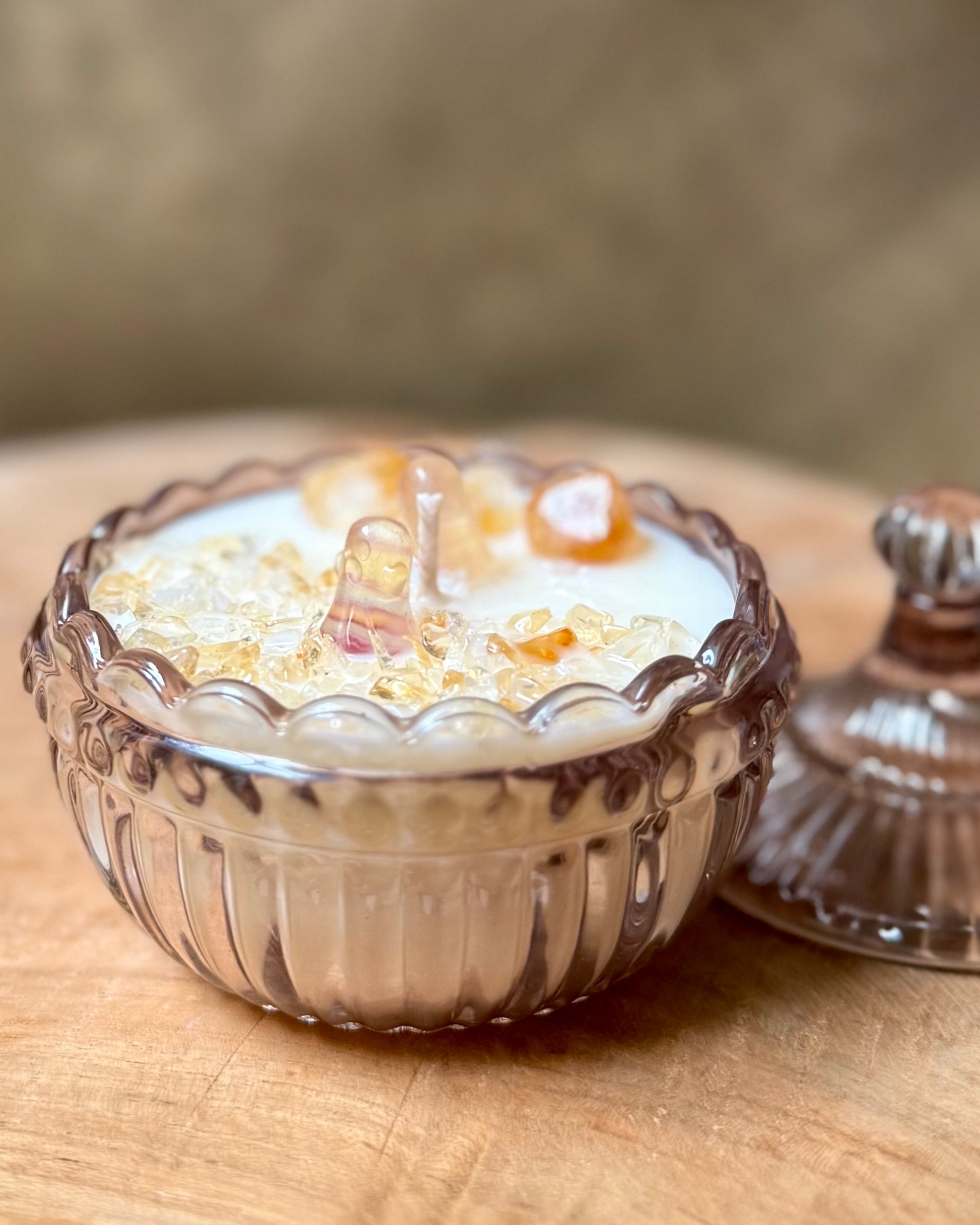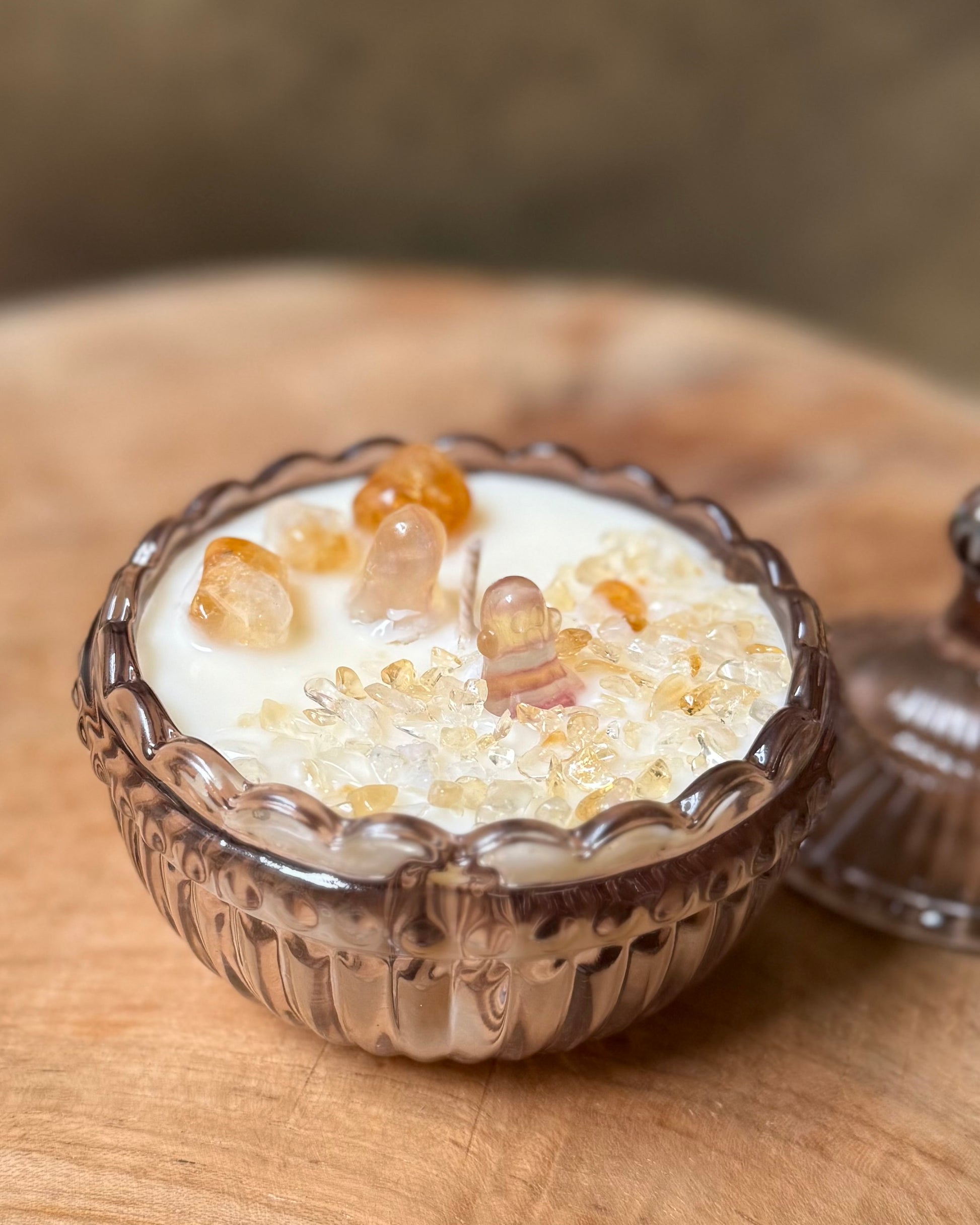 Deze kaars is opgemaakt met een spookje en skull van regenboog Fluoriet, heated Amethist split en heated Amethist trommelsteentjes.
