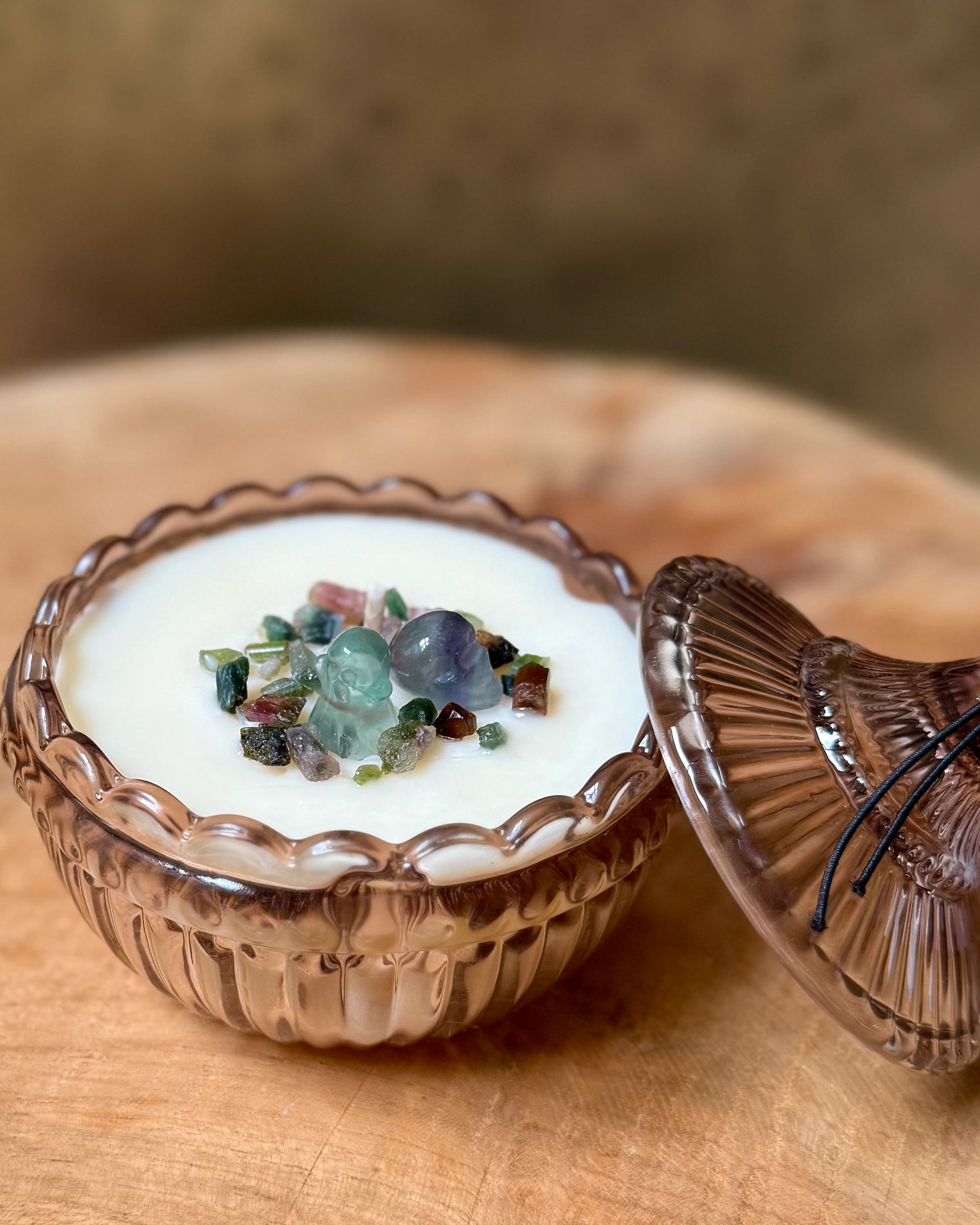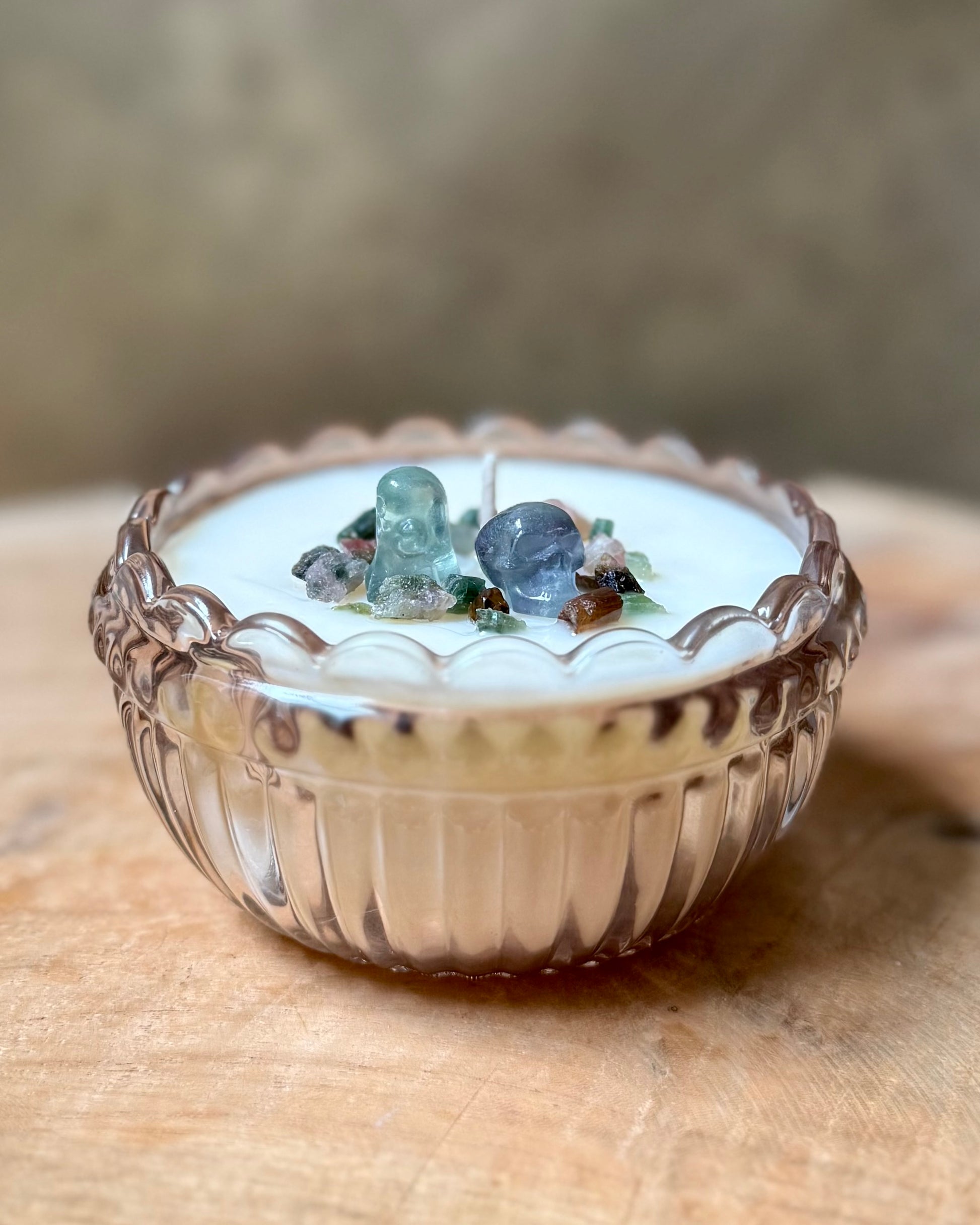 Deze kaars is opgemaakt met een spookje en skull van regenboog Fluoriet en ruwe Groene Toermalijn split.