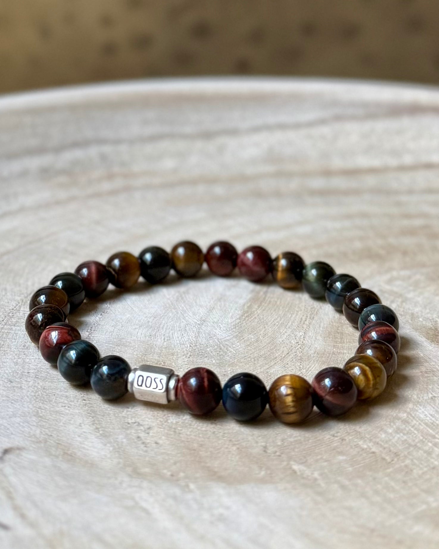 De armband bestaat uit een mix van Tijgeroog, Kattenoog en Valkenoog. samen versterken ze de werking: zelfvertrouwen,  bescherming en focus.