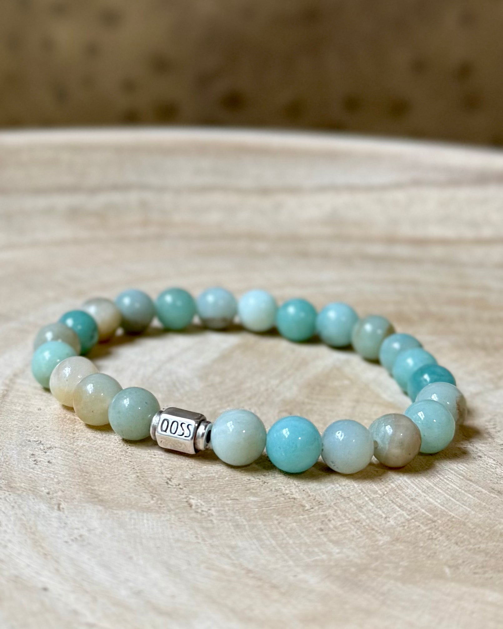 Een natuurstenen kralen armband geregen op elastiek, voorzien van een zilverkleurige kraal met qoss van hoogwaardig, nikkelvrij metaal. De kralen zijn ongeveer 8mm.