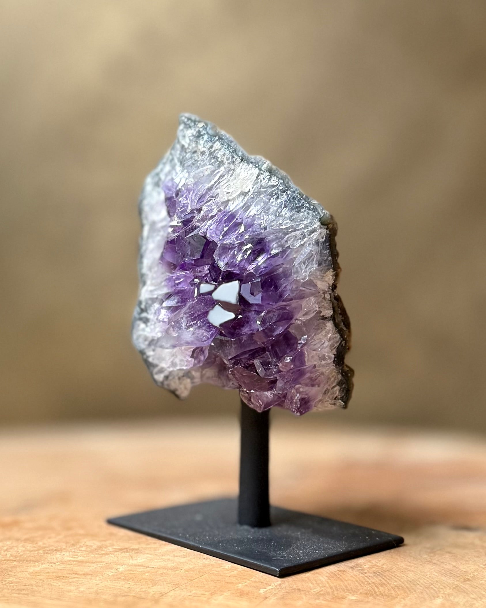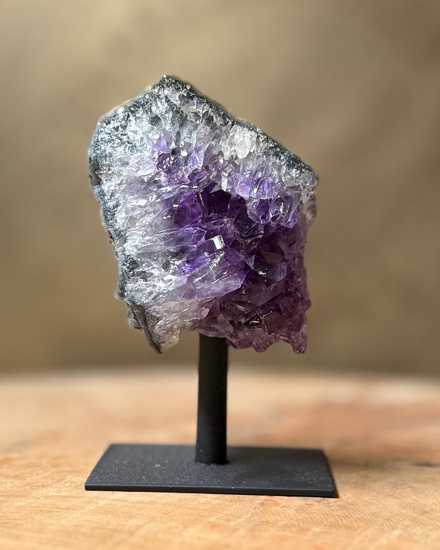 Mooie, donkerpaarse, ruwe Amethist op standaard.