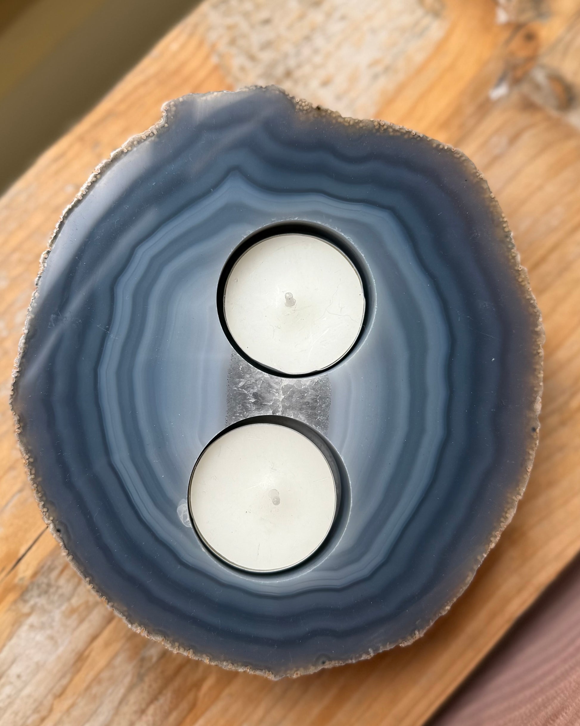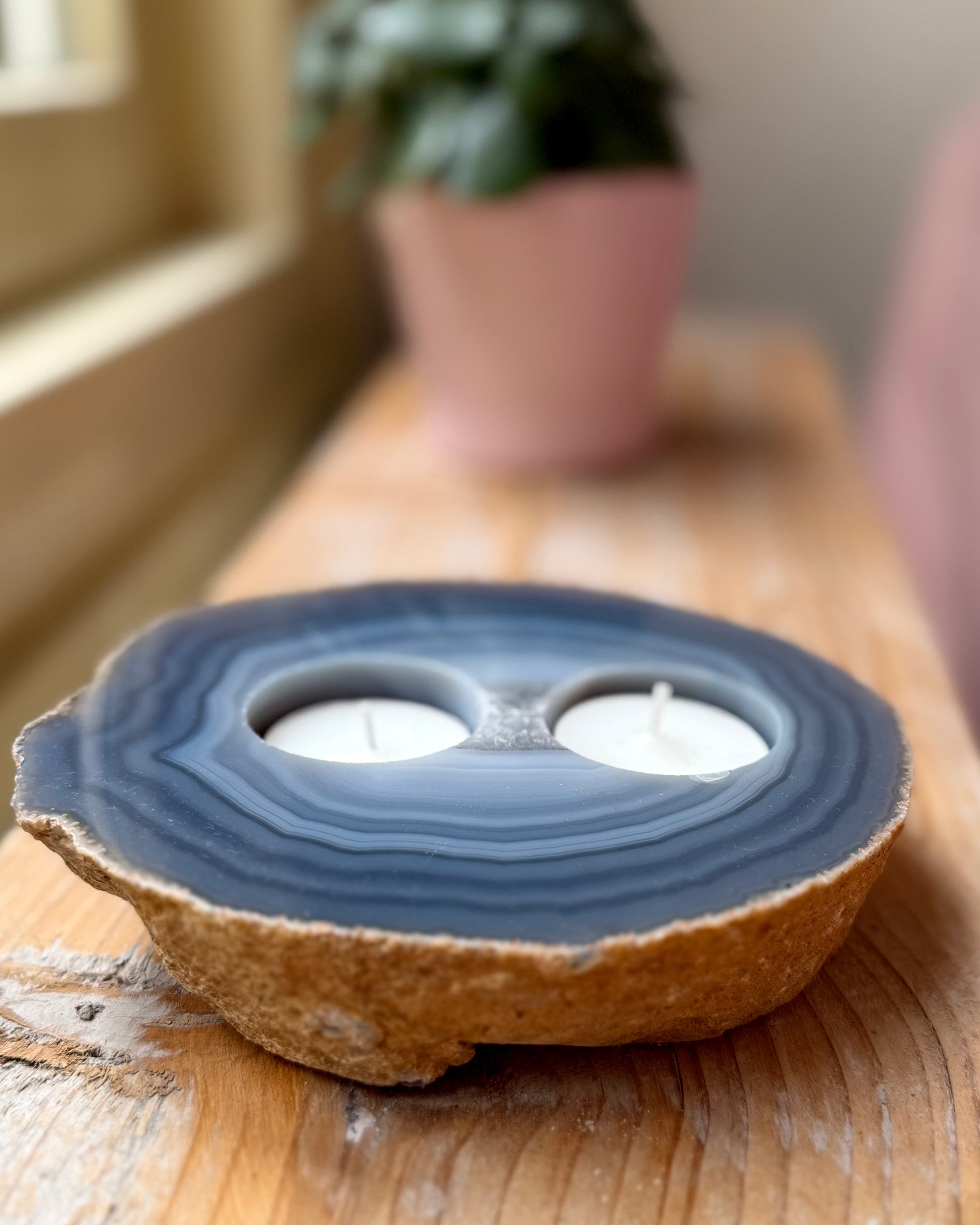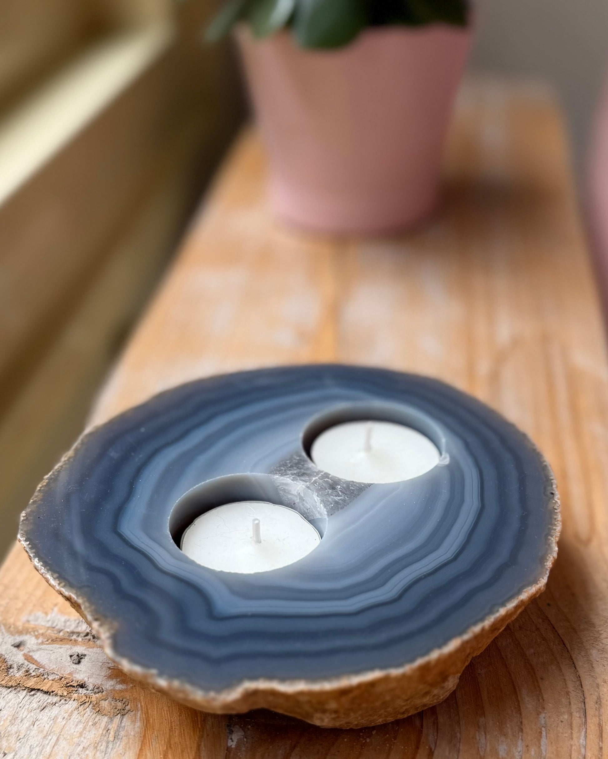 Grote waxinelichthouder van plat stuk agaat van   870 gram, ca 14 x 13 x 3,5 cm