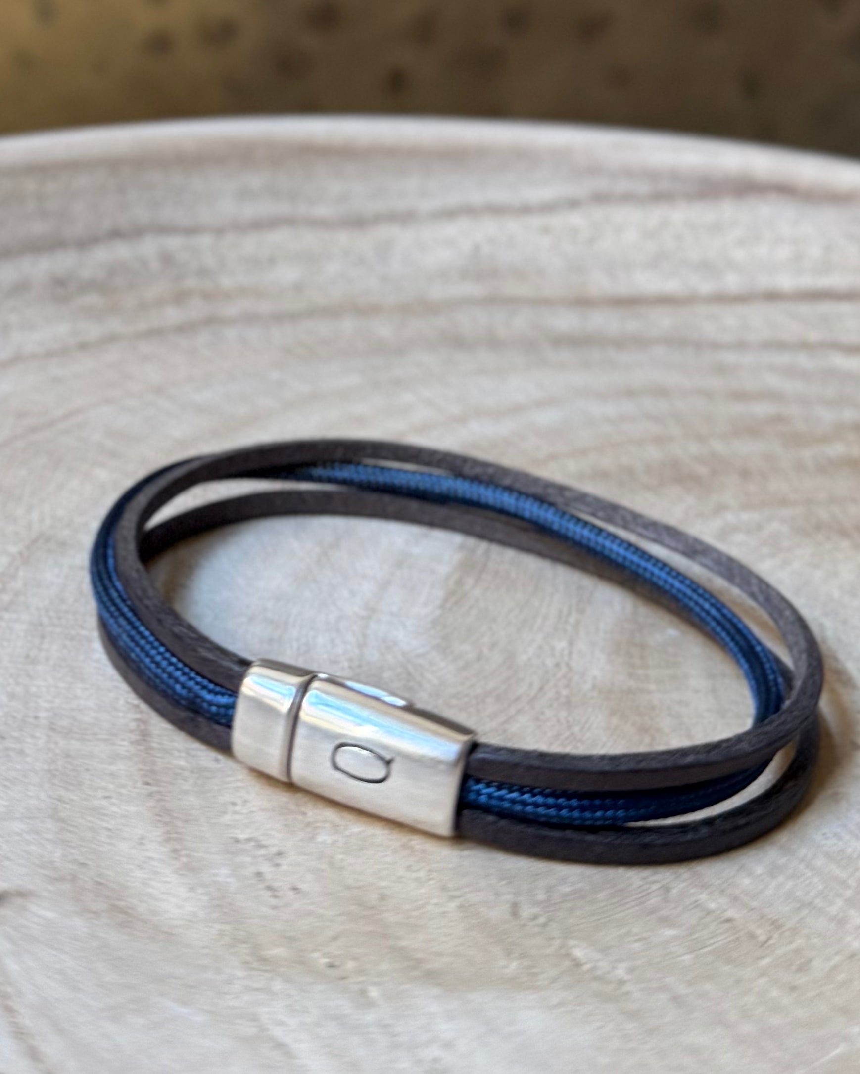 Een armband gemaakt van twee leren banden met paracord in het midden. De armband sluit met  een zilverkleurige, hoogwaardige, nikkelvrije magneetsluiting. De armband is ongeveer 15mm breed.