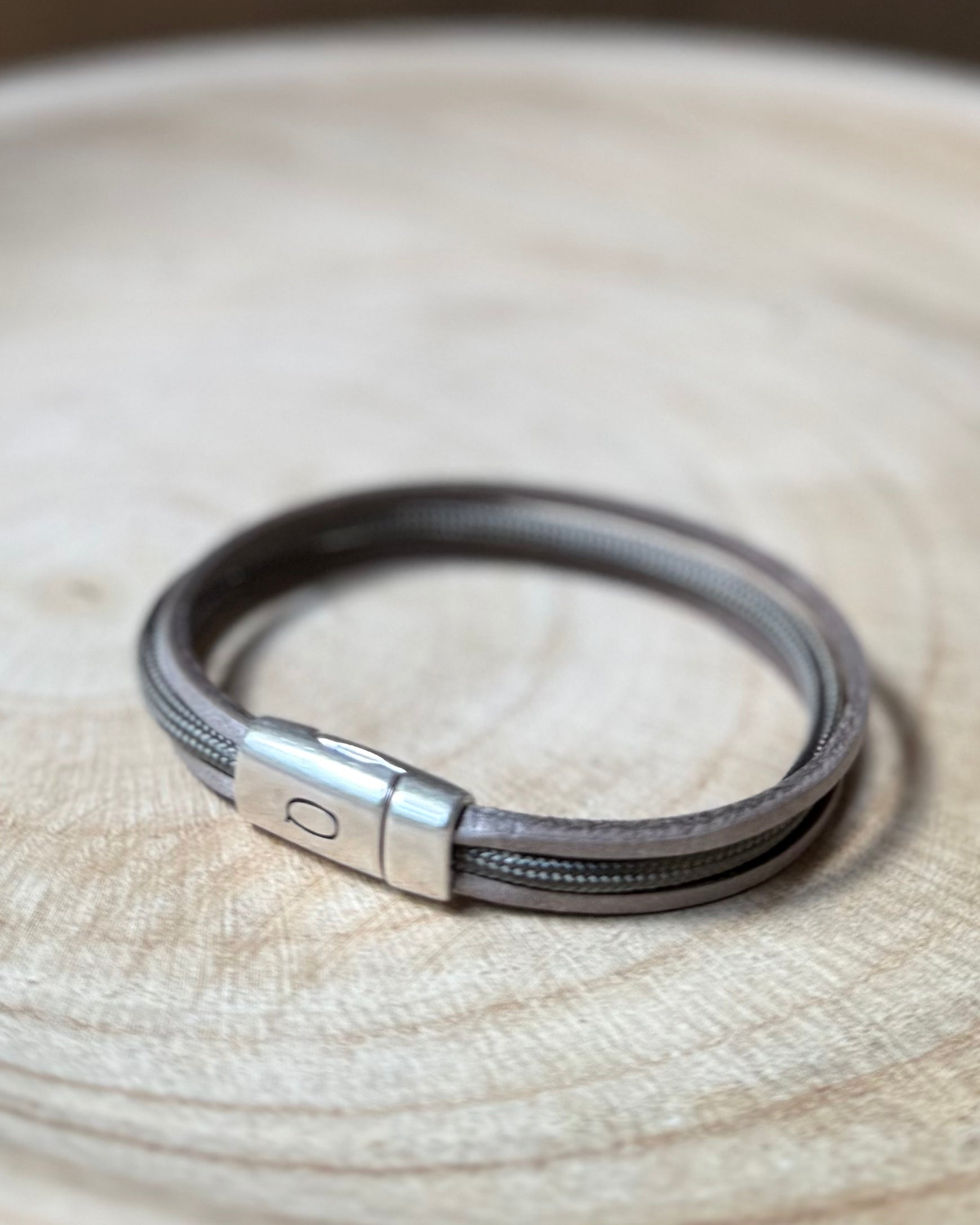 Een armband gemaakt van twee leren banden met paracord in het midden. De armband sluit met  een zilverkleurige, hoogwaardige, nikkelvrije magneetsluiting. De armband is ongeveer 15mm breed.