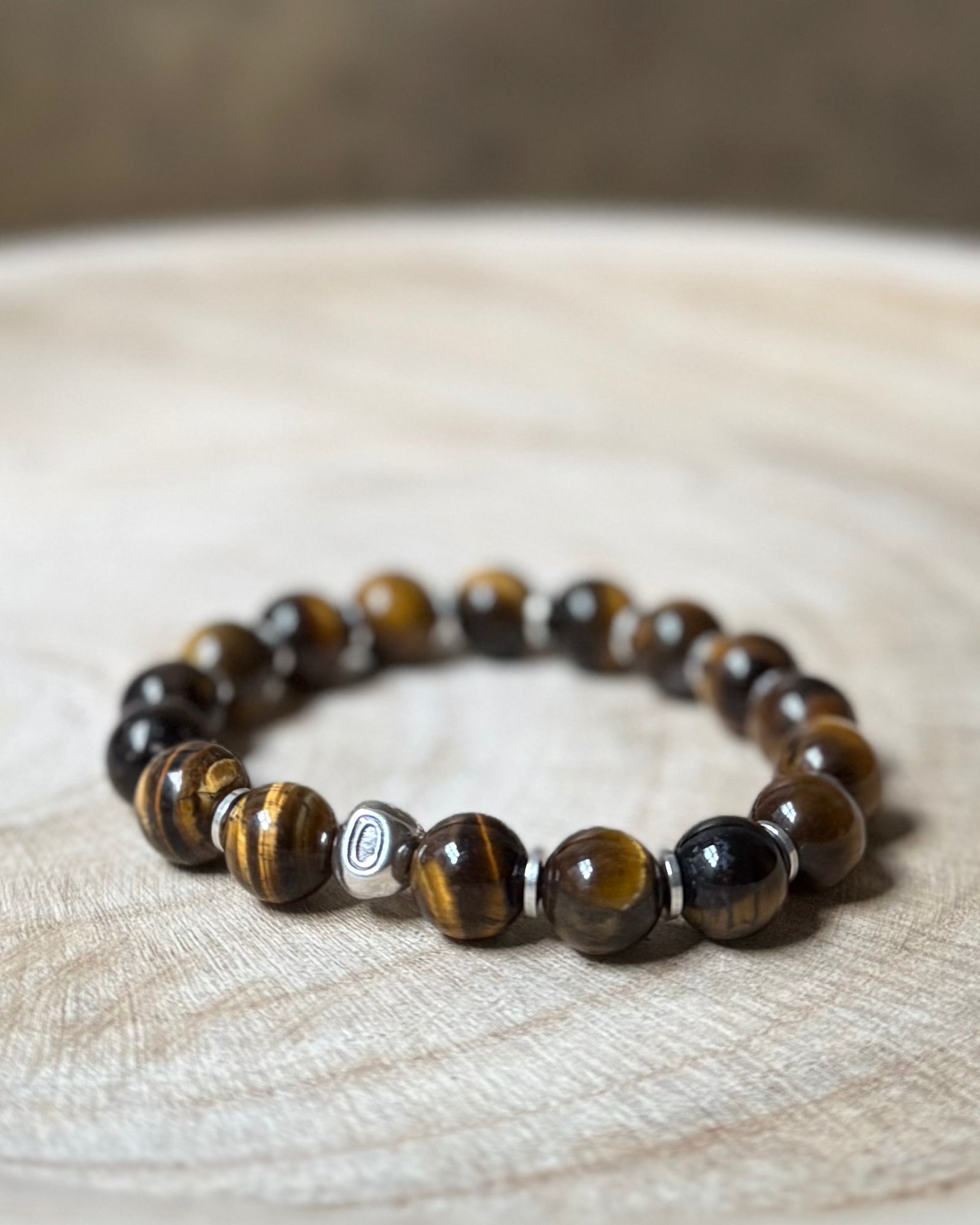 Een kralen armband van Tijgeroog geregen op elastiek, voorzien van zilverkleurige platte kralen en een kraal met QOSS van hoogwaardig, nikkelvrij metaal. De kralen zijn ongeveer 10mm.