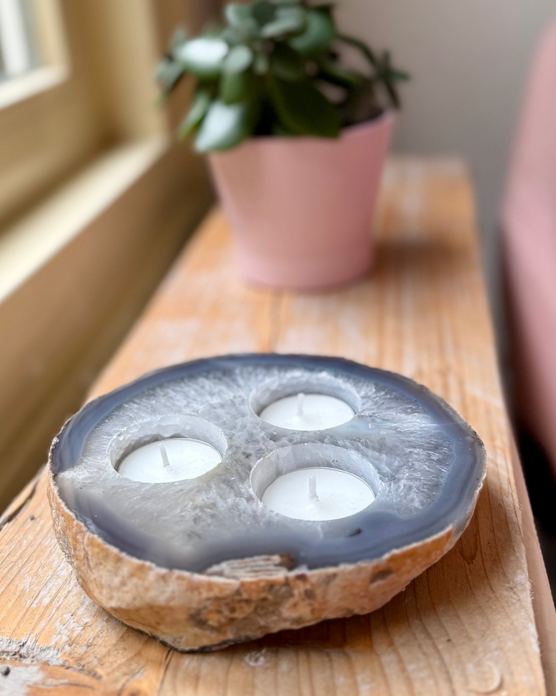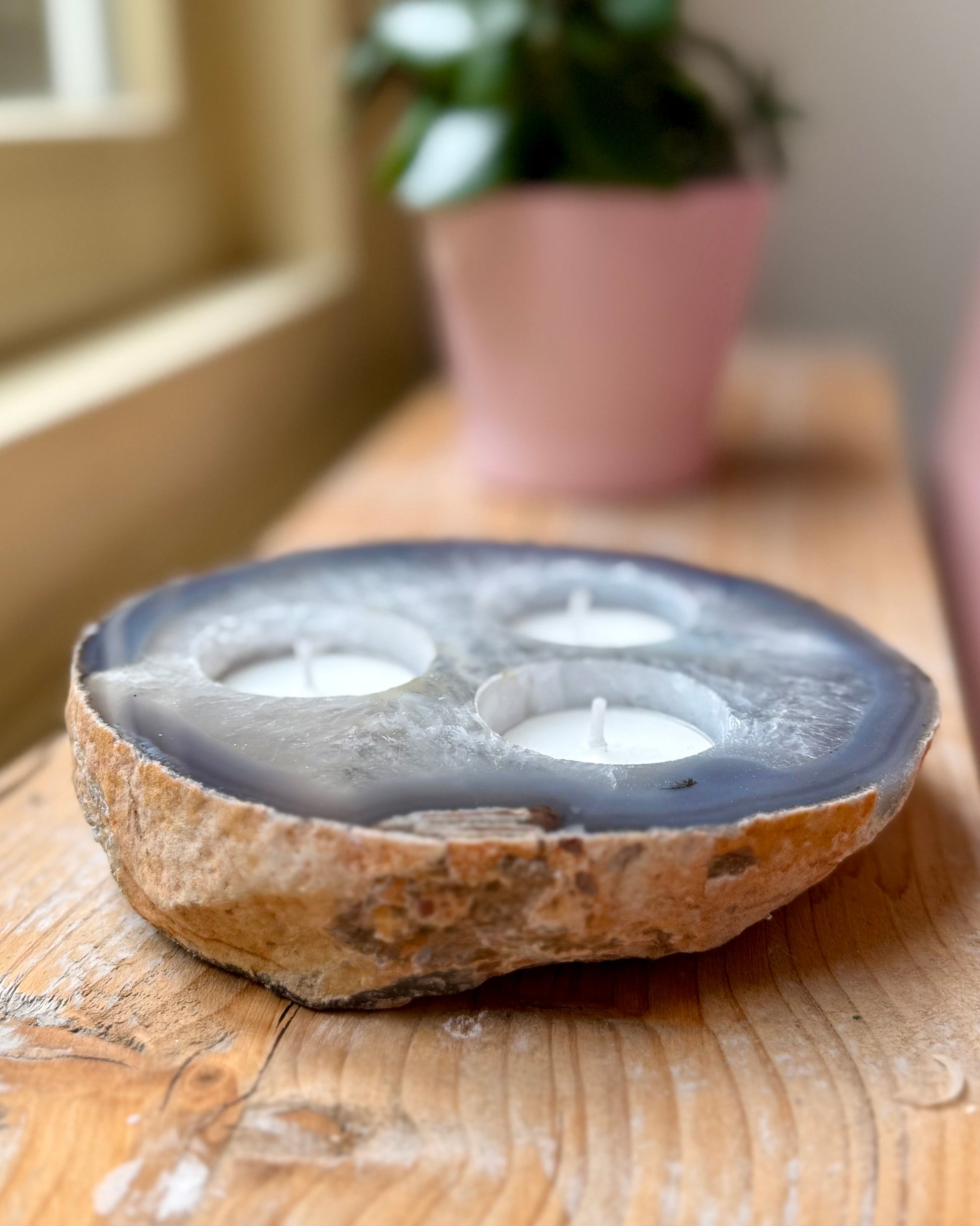 Grote waxinelichthouder van plat stuk agaat van 948 gram, ca 15 x 14 cm x 3 cm