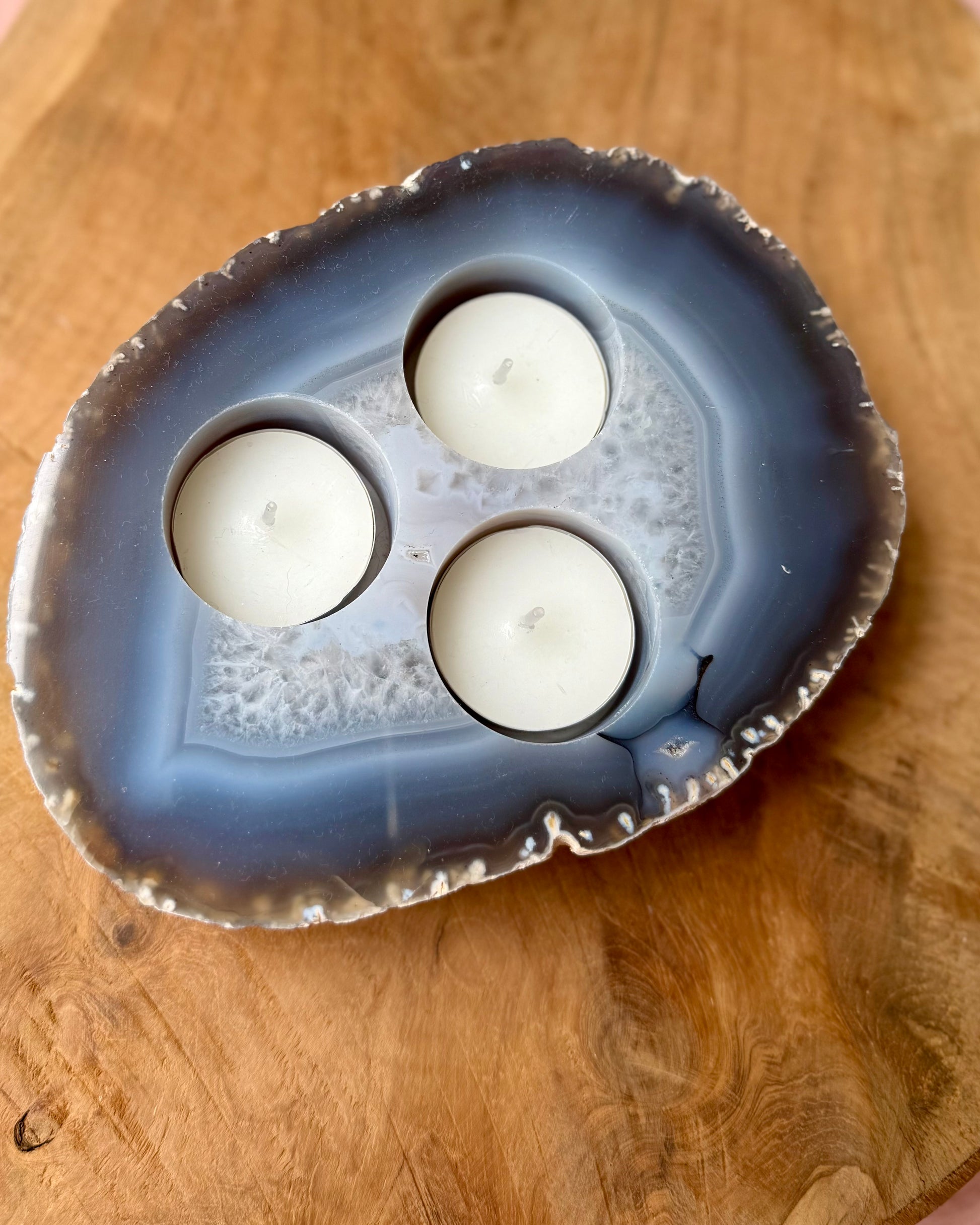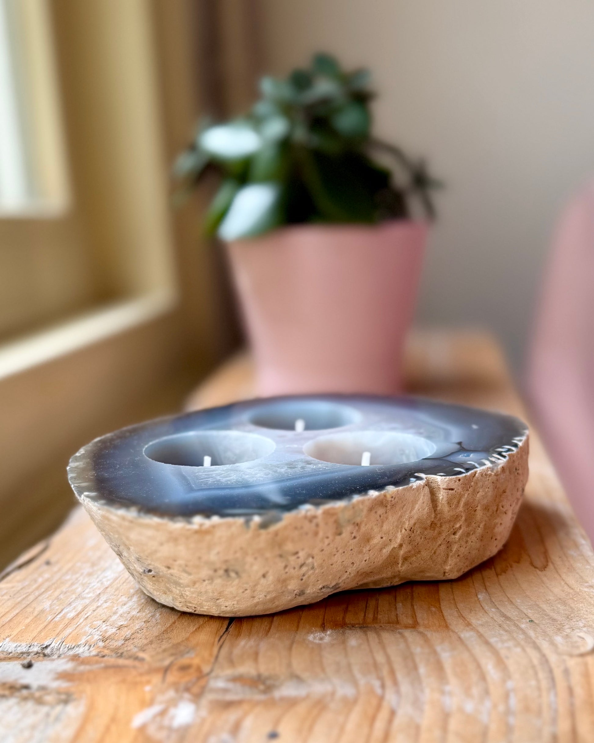 Grote waxinelichthouder van plat stuk agaat van 1076  gram, ca 16 x 12,5 cm x 3,5 cm