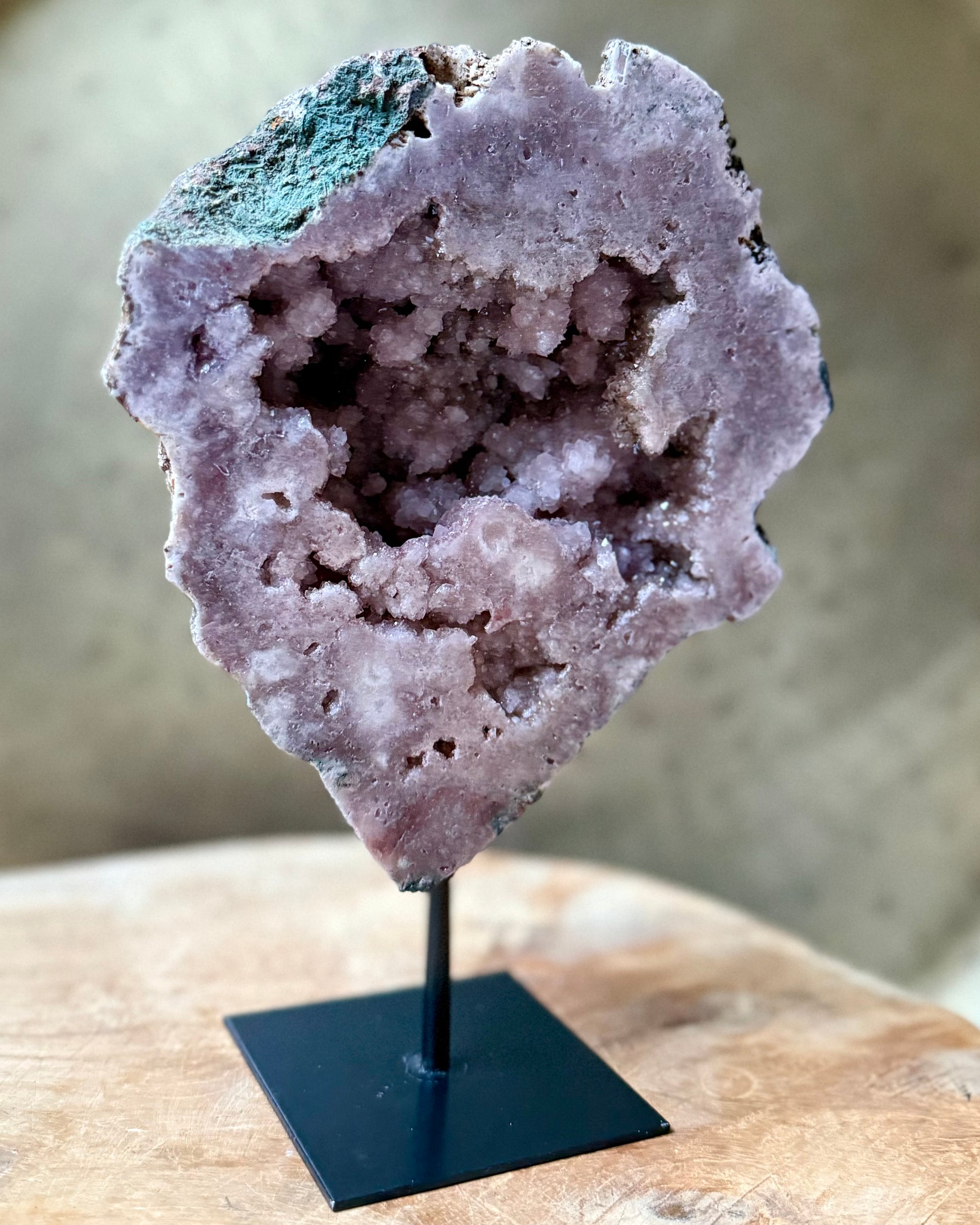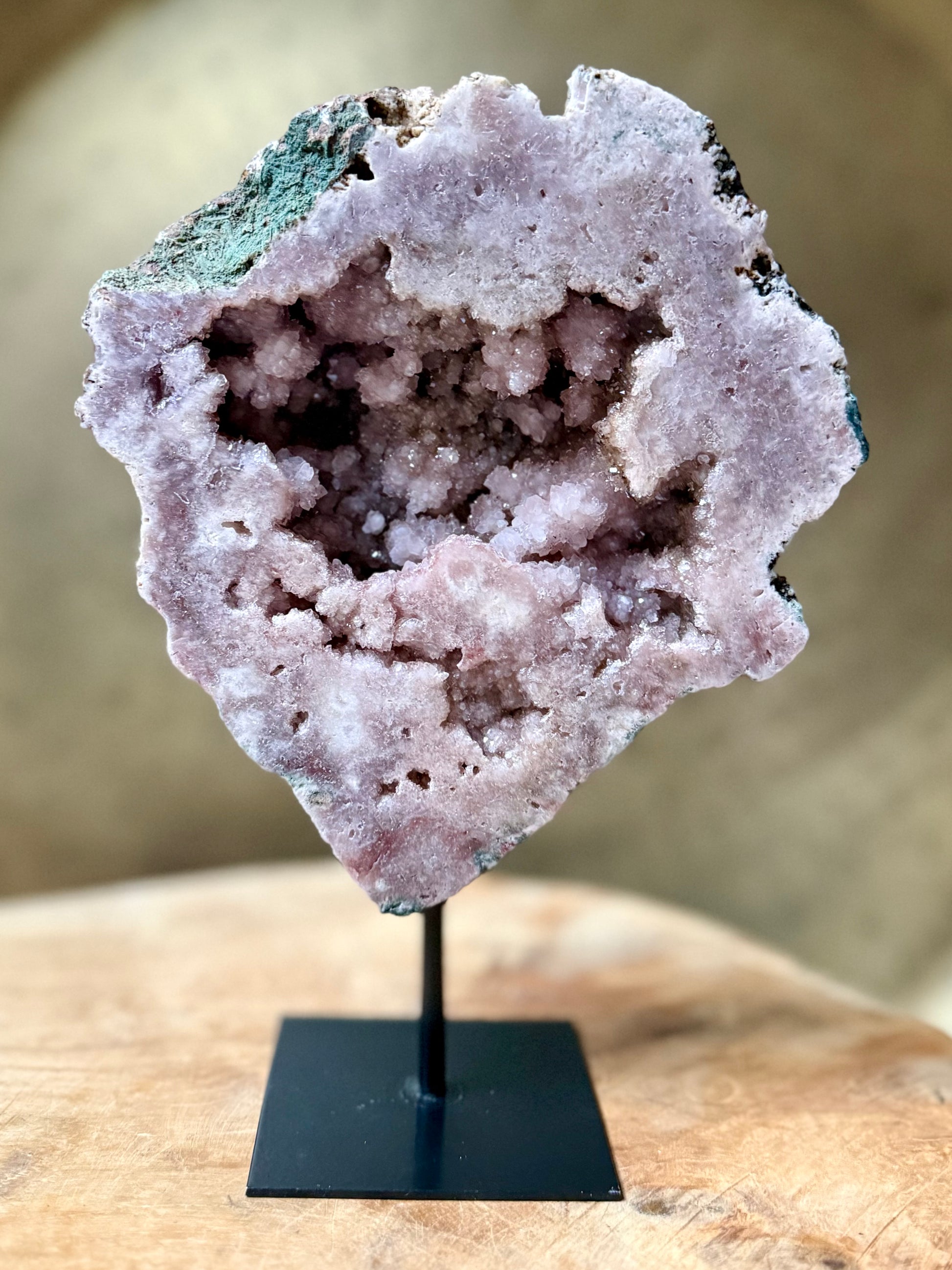 Prachtig stuk Roze Amethist op standaard, prachtige kleur en vol met kristallen. Een echte eyecatcher. hoogte: 23 cm breedte: 16 cm gewicht: 1158 gram