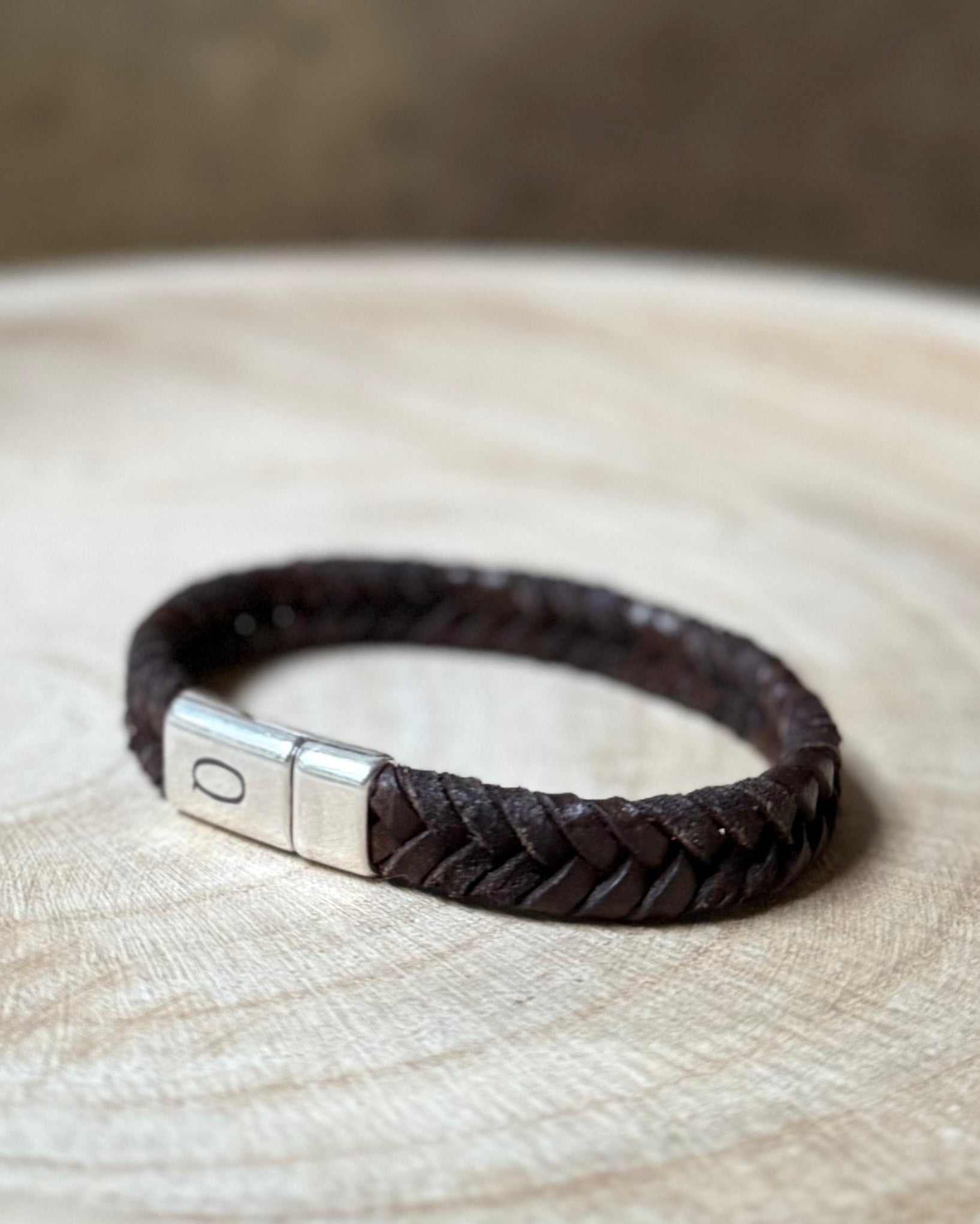 Een gevlochten leren armband in donkerbruin voorzien van een zilverkleurige, hoogwaardige, nikkelvrije magneetsluiting. De vlecht is ongeveer 10 mm breed.