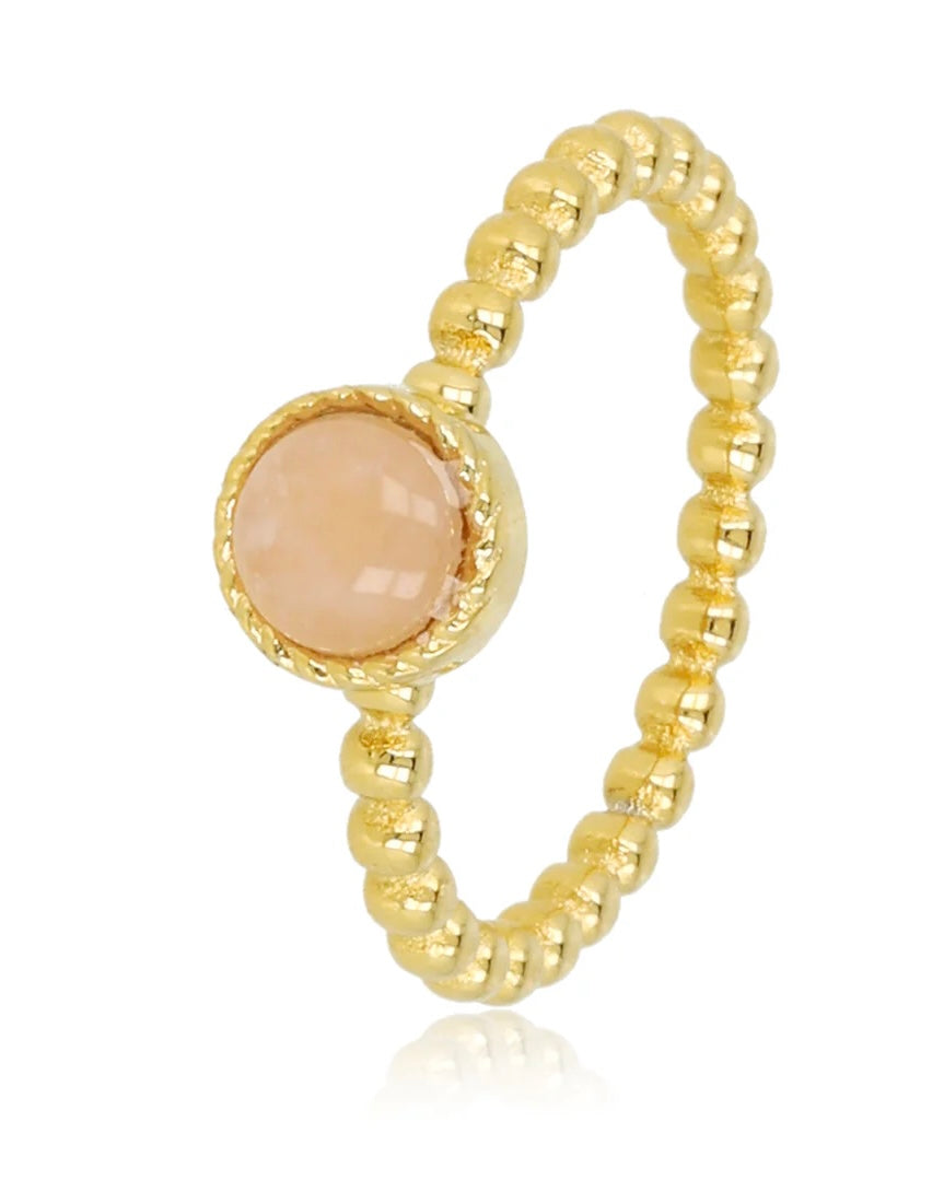 Deze goudkleurige ring met rozenkwarts (rose quartz) straalt rust en elegantie uit. De fijne bolletjesstructuur geeft het ontwerp een speels maar verfijnd karakter, terwijl de natuurlijke edelsteen zorgt voor een subtiel kleuraccent. De steen staat bekend om zijn zachte en liefdevolle uitstraling. Dankzij het gebruik van stainless steel met 14K gold plating is de ring duurzaam en geschikt voor dagelijks gebruik. Mooi om solo te dragen of te combineren met andere ringen.